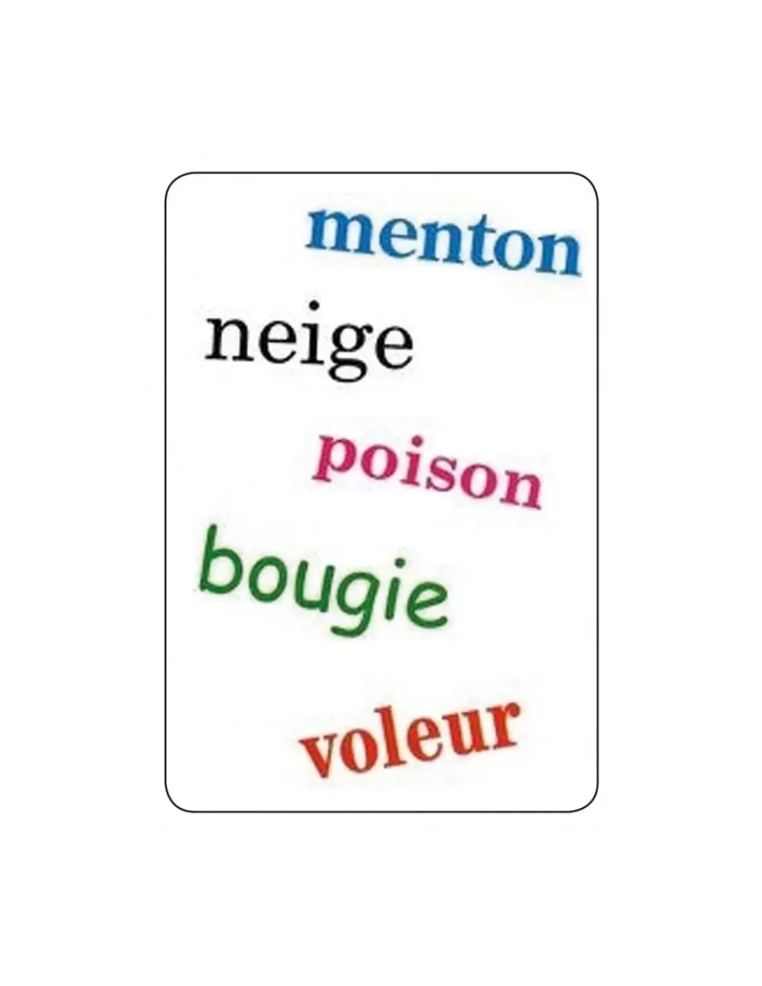 Ce jeu de cartes permet d’automatiser la voie d’assemblage, de stimuler l’évocation mentale, d’augmenter le lexique interne, de favoriser la compréhension du mot et de renforcer les capacités visuo-attentionnelles.
