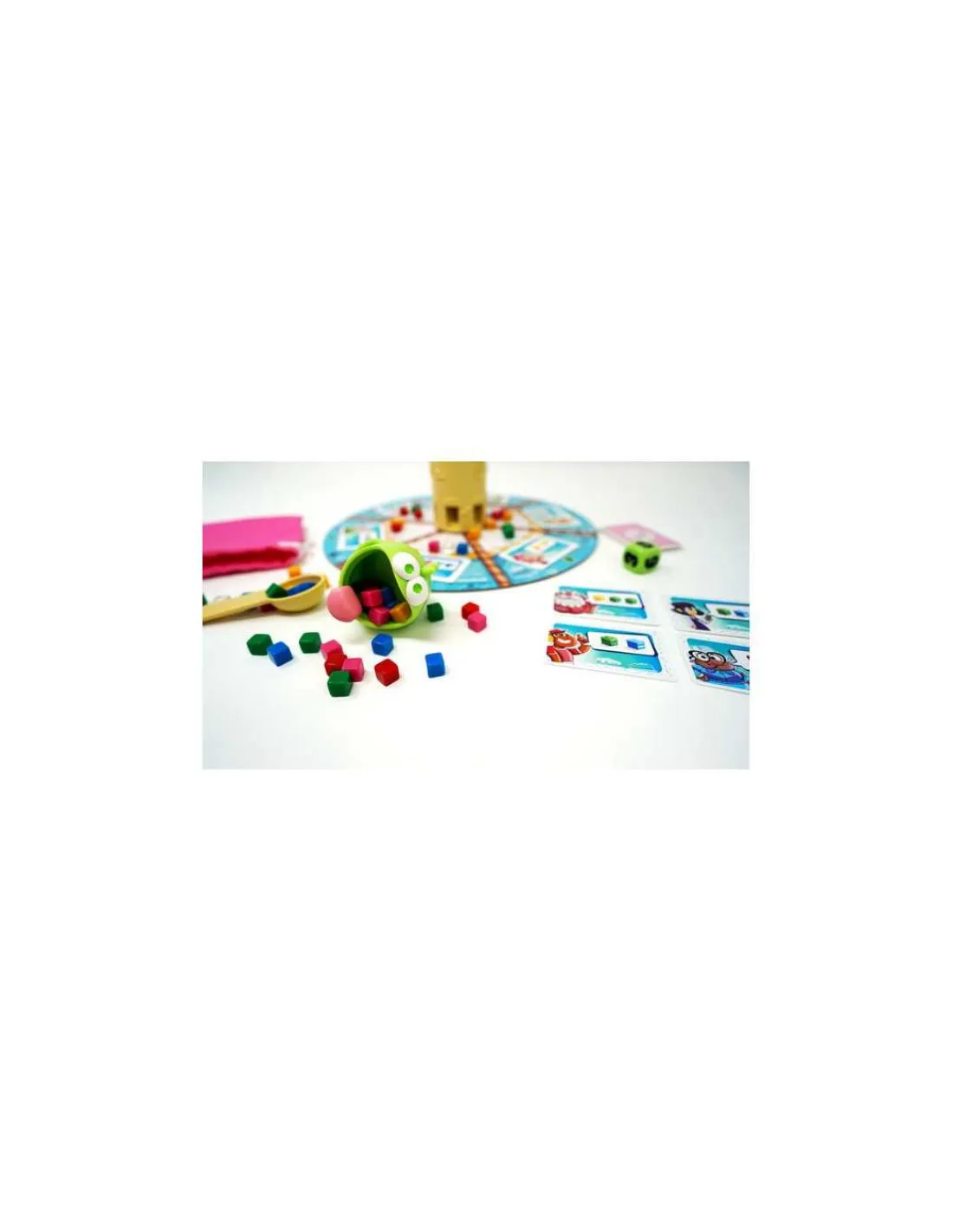 La boite de jeu contient 1 plateau central, 1 distributeur de gâteaux constitué d’une tour et d’un déversoir, 58 cubes représentant les cakes répartis en 6 couleurs, 1 sac en tissu et une cuillère, 20 cartes Commande, la figurine du monstre Cakozaurus et son dé de mouvement et la règle du jeu.