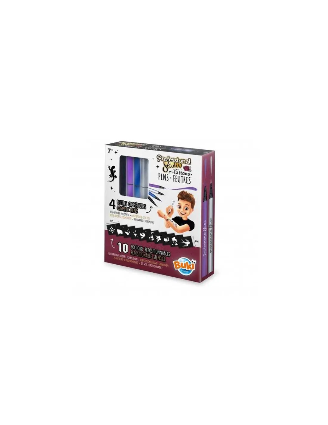 Le coffret contient 4 feutres de tatouage cosmétiques, 10 pochoirs repositionnables et 1 notice illustrée.