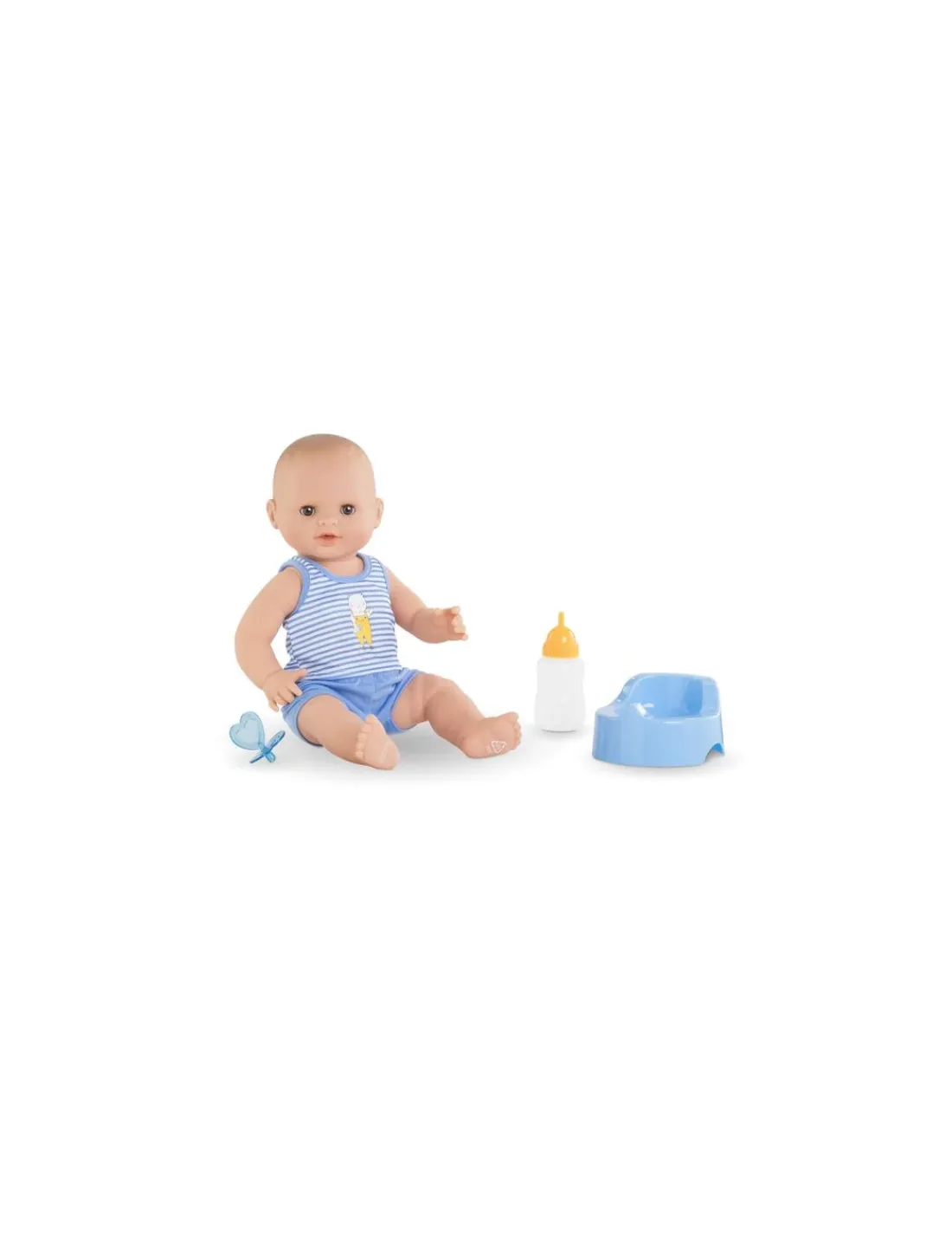 Ce grand poupon Corolle sexué garçon boit son biberon qui se remplit d’eau, fait pipi sur son pot lorsqu’on lui appuie sur le ventre et va dans l’eau.