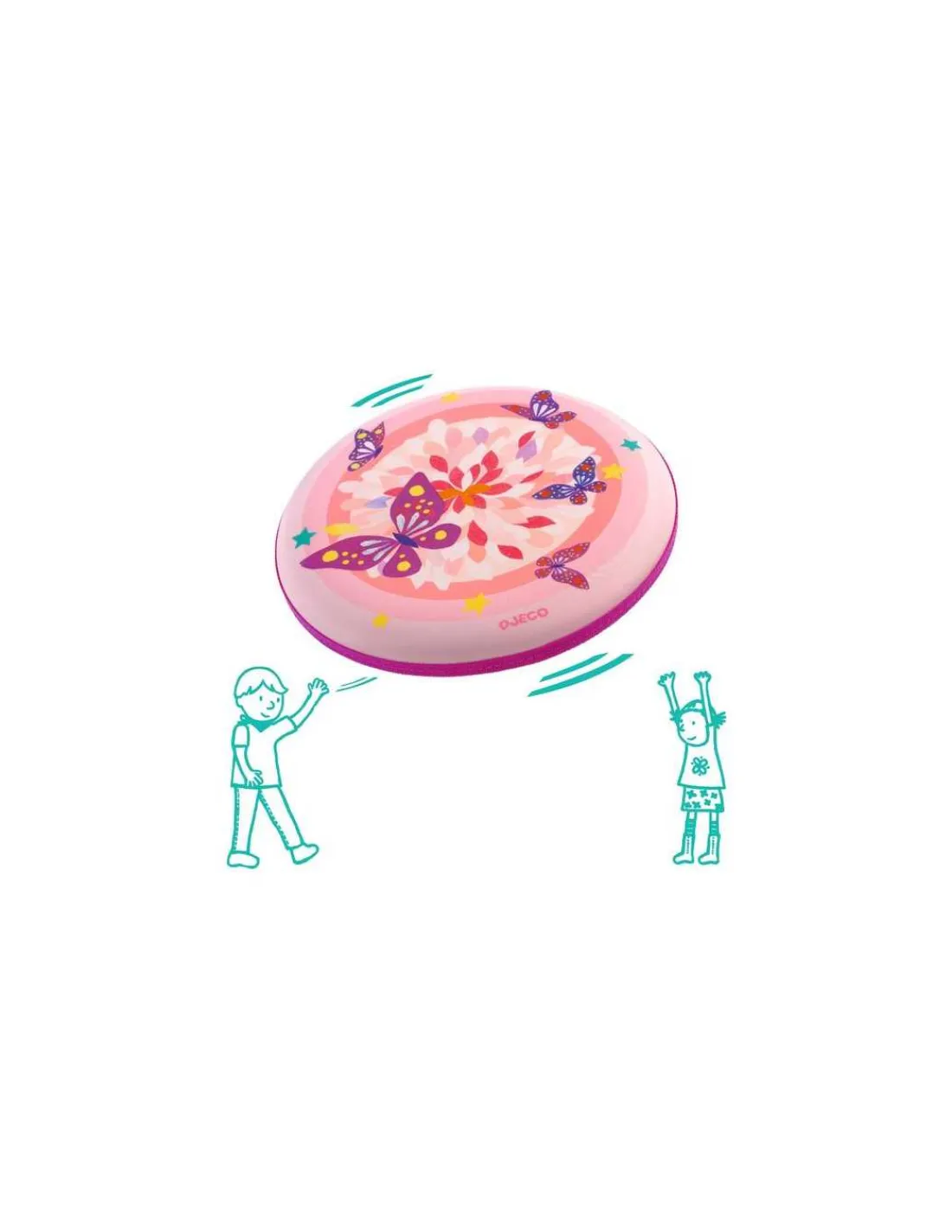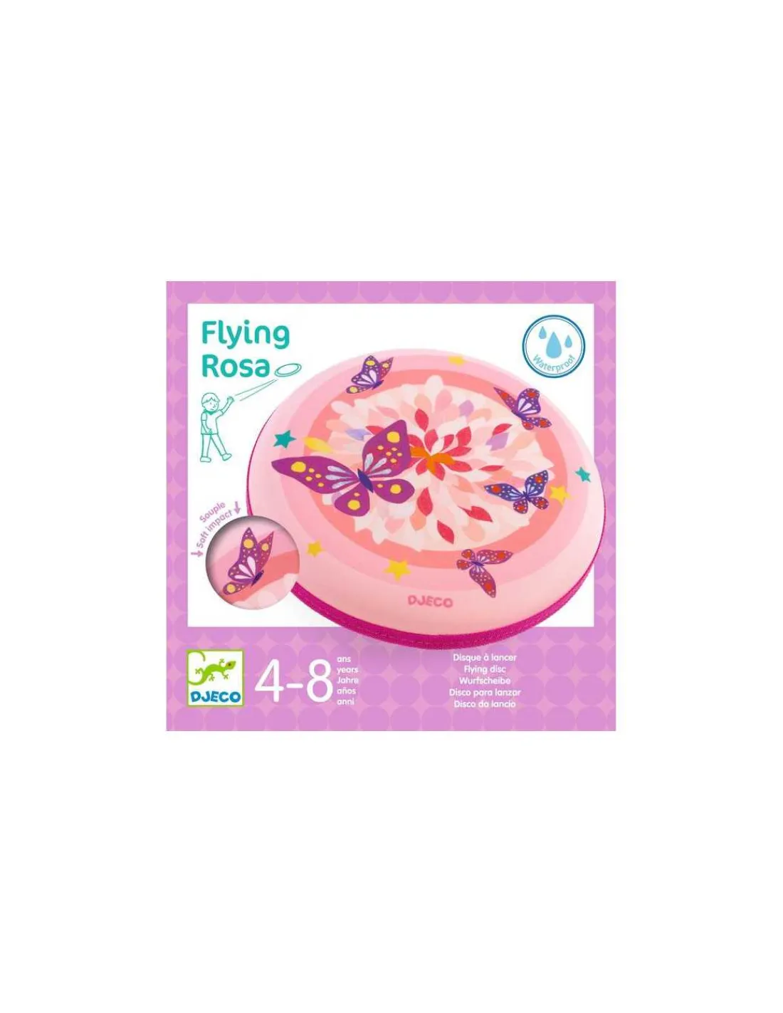 Découvrez le disque à lancer Flying Rosa de Djeco, un frisbee rose en mousse légère, résistant à l’eau et souple, pour jouer sans danger dès 4 ans.