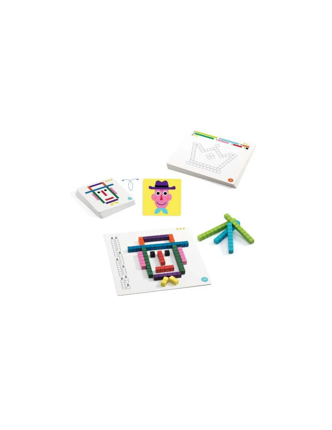 Ce jeu astucieux constitue une introduction ludique aux mathématiques et aide les enfants à comprendre les notions de mesure et de distance de manière accessible et divertissante. L’enfant reproduit des images en utilisant des bâtonnets de différentes longueurs.
