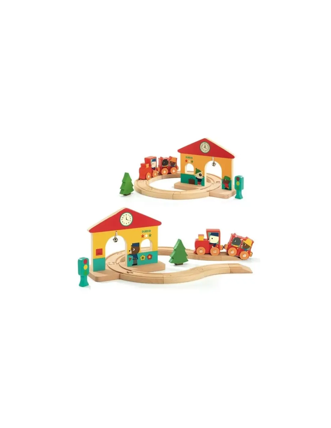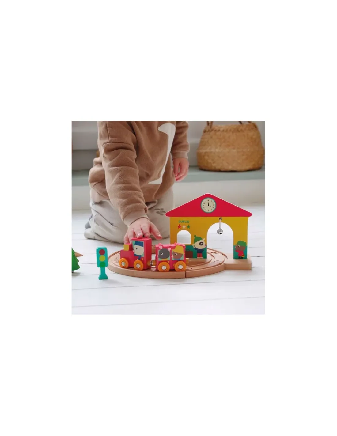Découvrez le jeu de manipulation Minitrain de Djeco, un premier circuit de train en bois pour les enfants à partir de 18 mois. Un petit circuit avec une gare, un feu tricolore, un sapin, et un train magnétique composé d’une locomotive et d’un wagon.