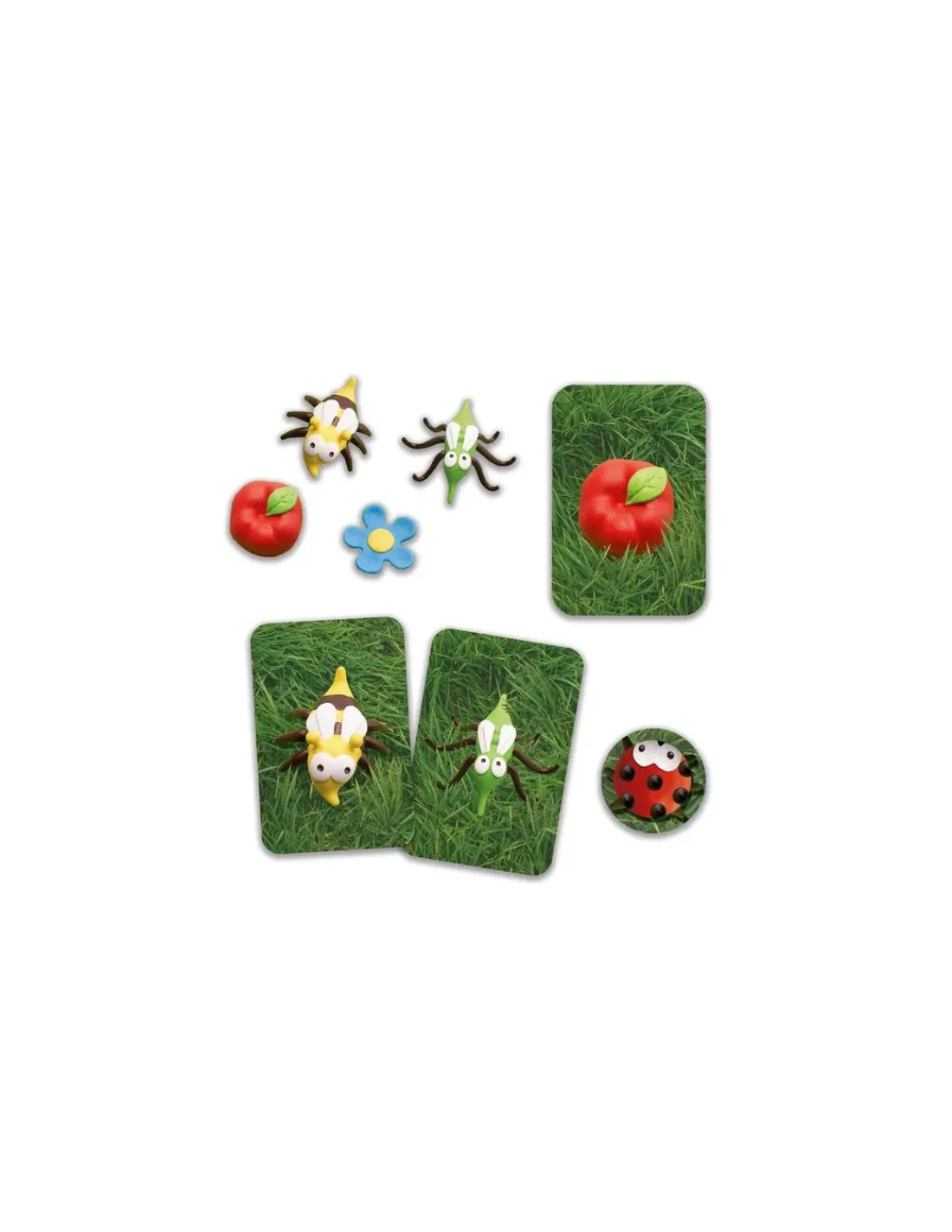 Le jeu contient : 48 cartes (16 Moustiques, 16 Abeilles, 16 Pommes), 7 figurines (4 Abeilles, 1 Moustique, 1 Fleur, 1 Pomme), 25 jetons Coccinelles et la règle du jeu.