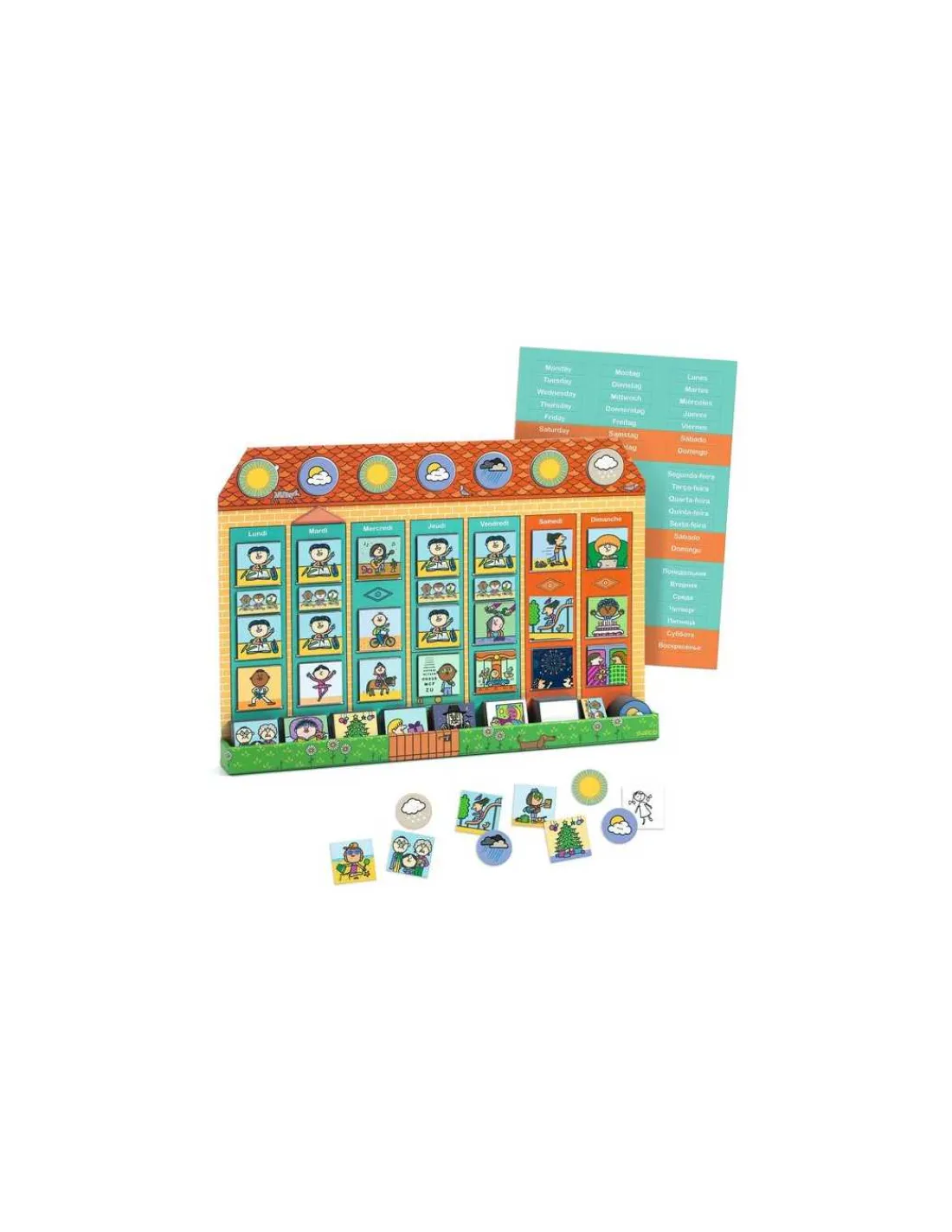 Pour une expérience enrichissante, des autocollants sont inclus, proposant les jours de la semaine en quatre langues différentes, permettant ainsi à l’enfant d’explorer et de s’approprier les notions du temps de manière polyglotte.