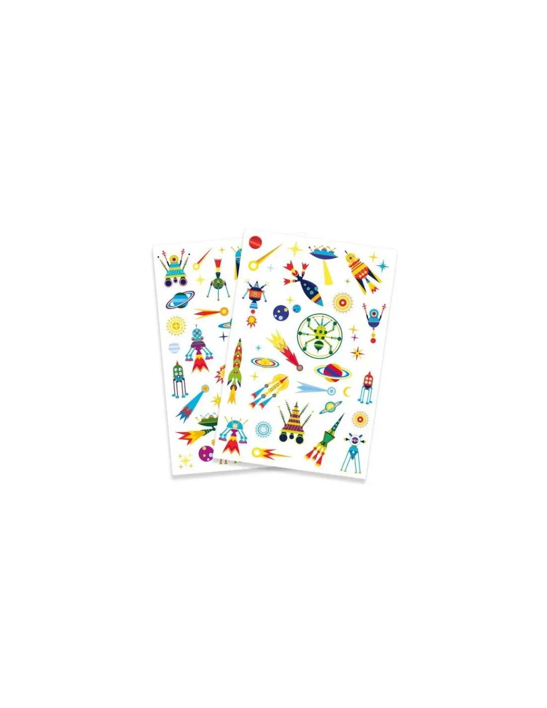 Découvrez les tatouages space oddity de Djeco, de jolis tatoos phosphorescents testés dermatologiquement pour les enfants à partir de 3 ans. Des tatoos qui brillent dans le noir sur le thème de l’espace et des planètes.