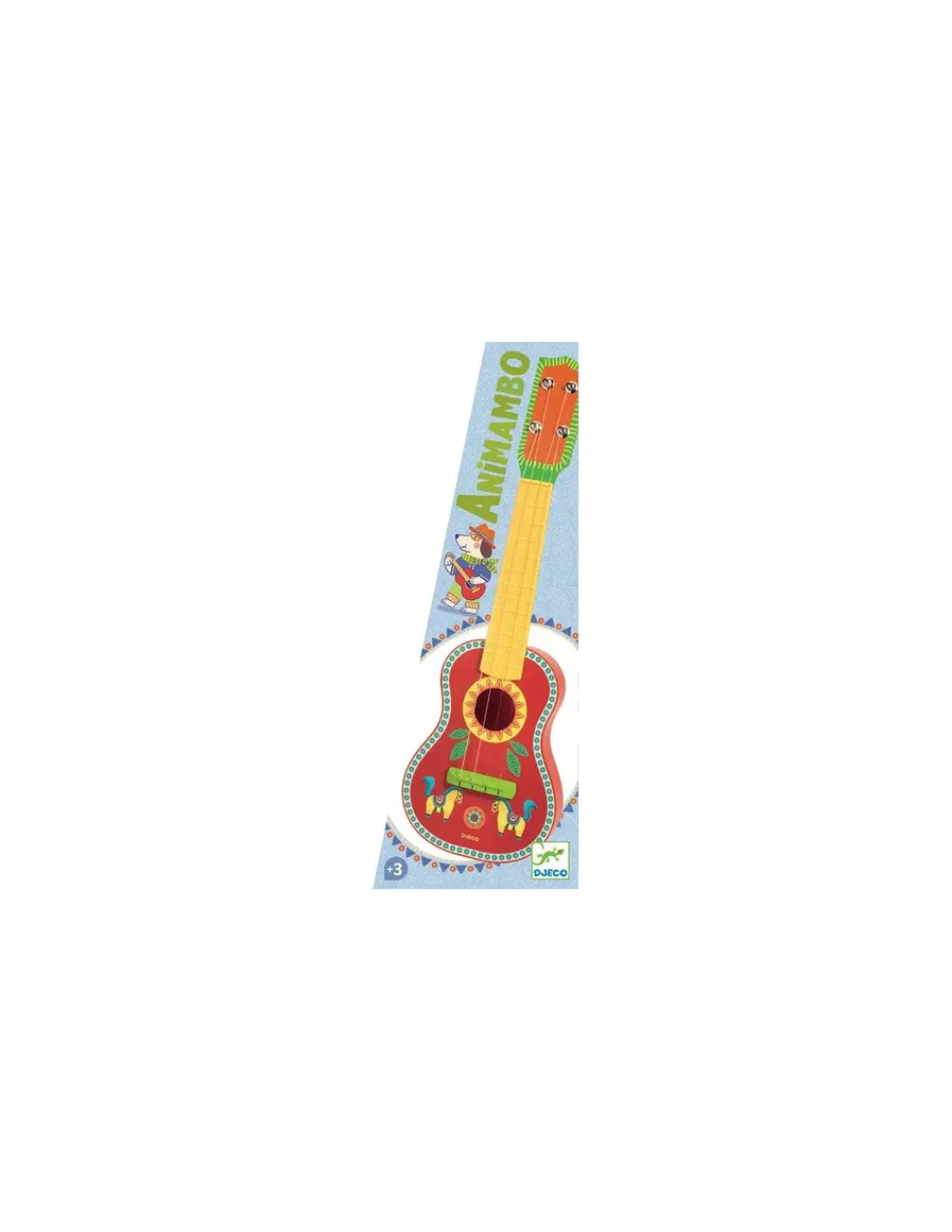 Découvrez la guitare ukulélé de la collection Animambo de Djeco, un magnifique instrument de musique très coloré avec sa caisse de résonance en plastique et sa tête en bois. Possédant 4 cordes, il est idéale pour les enfants dès 3 ans.