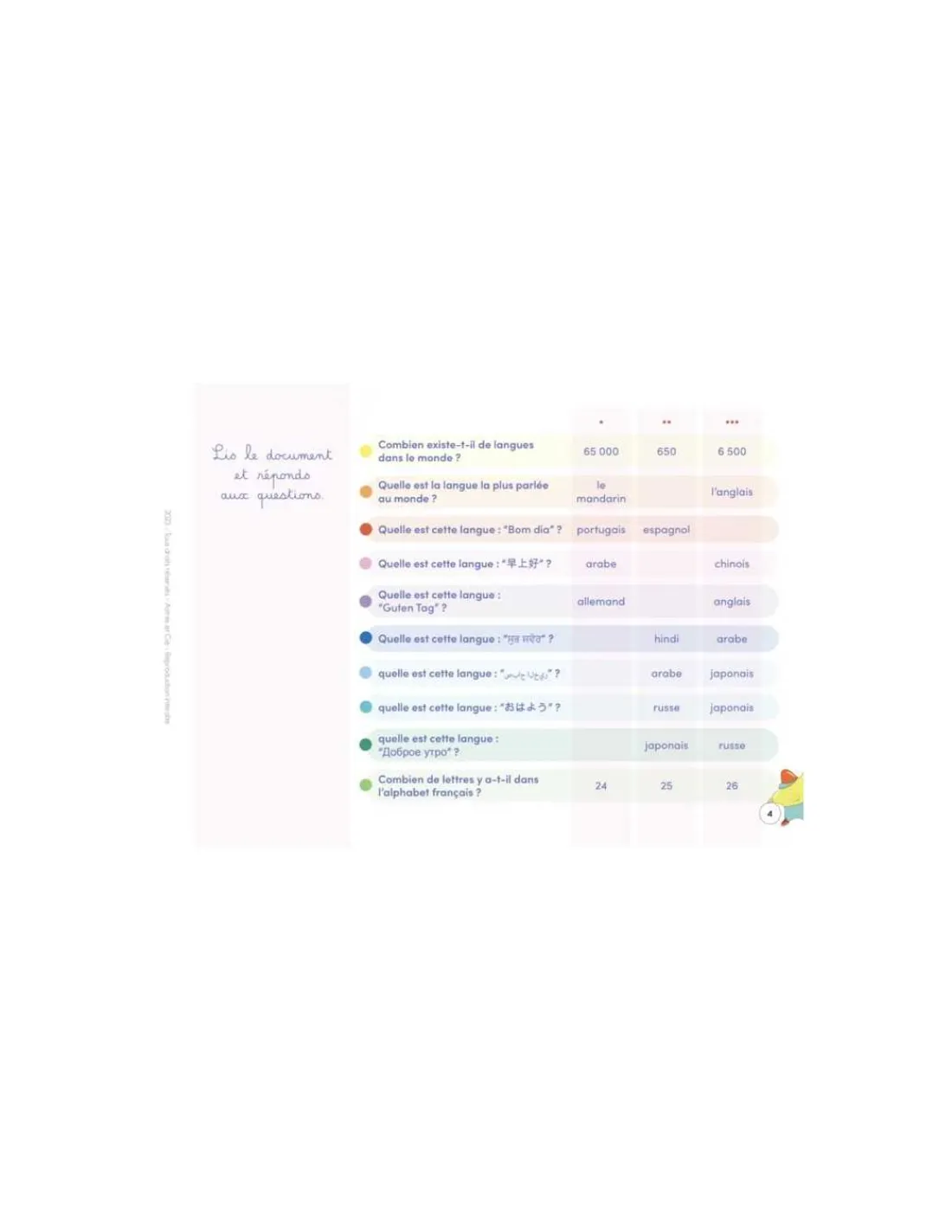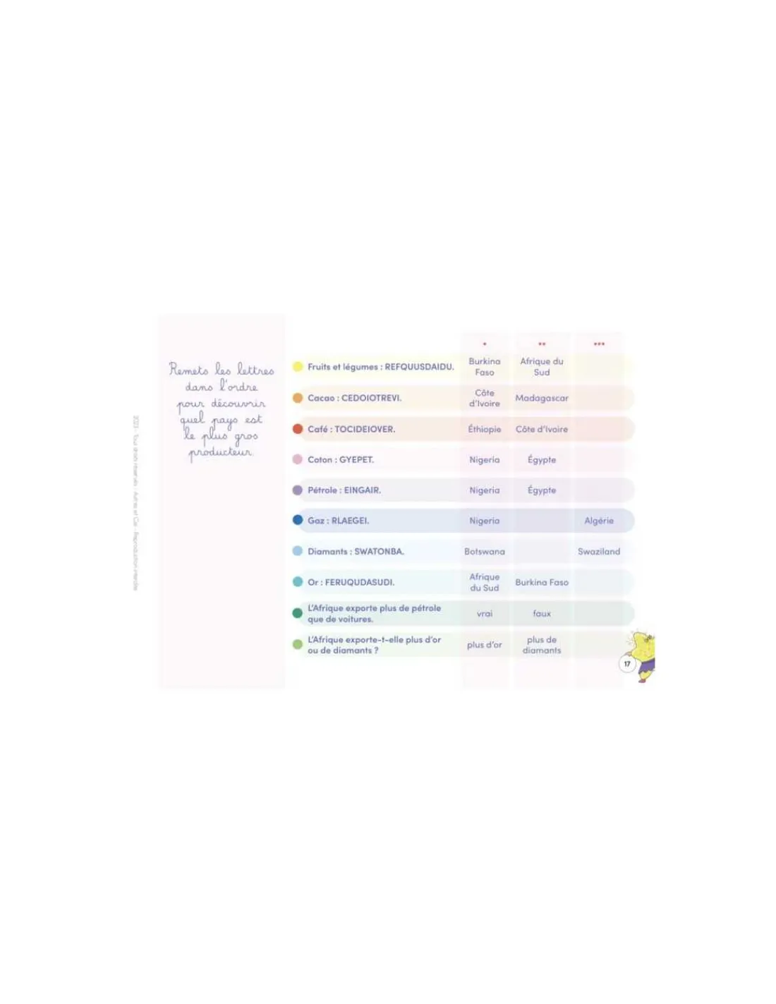 Ce coffret contient 50 illustrations (cartes ou documents), 50 fiches d’exercices, un tableau de réussite et 120 gommettes à gratter