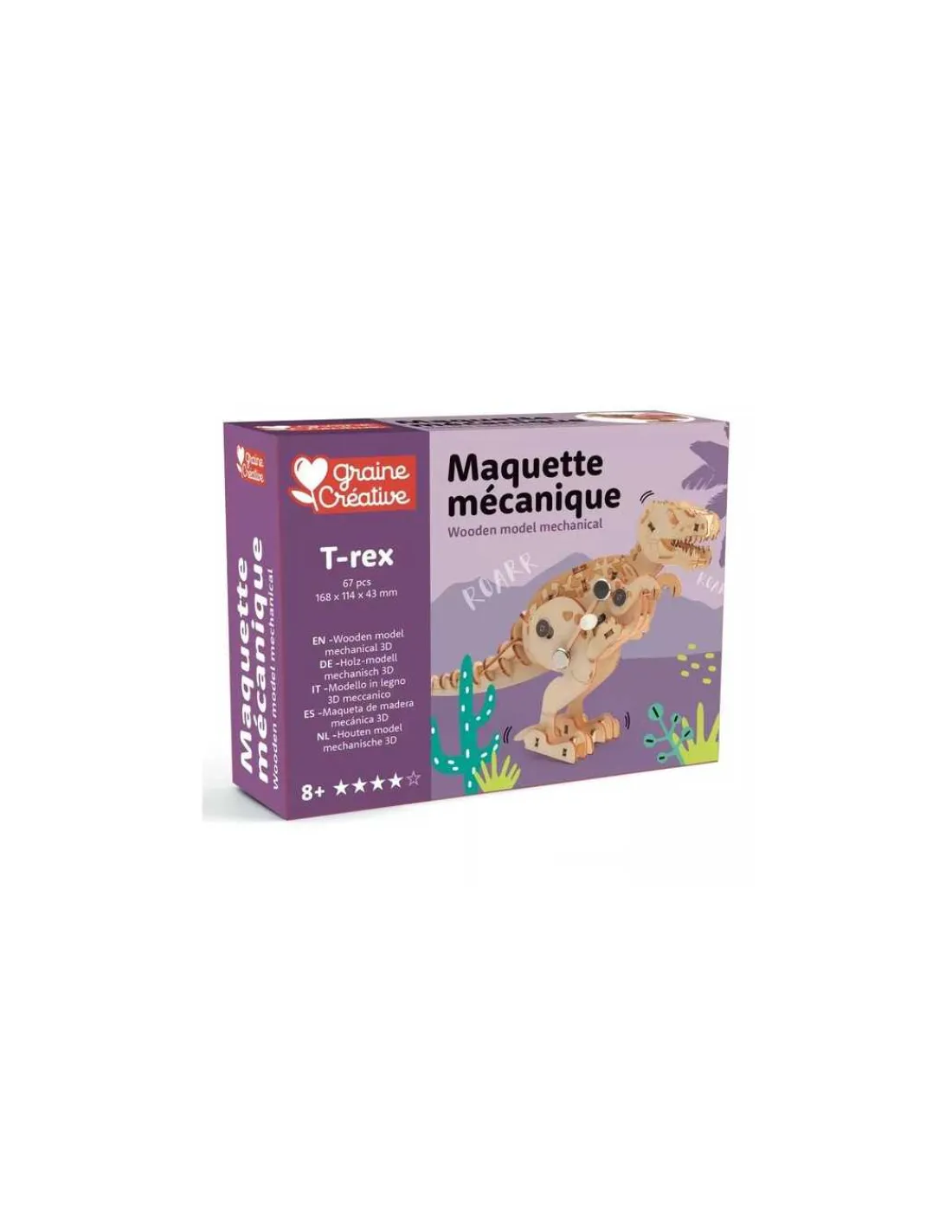 Découvrez la maquette 3D mécanique T-Rex de Graine Créative, un puzzle 3D en bois de 67 pièces représentant un majestueux dinosaure. Une maquette mécanique à assembler soi-même à partir de 8 ans.