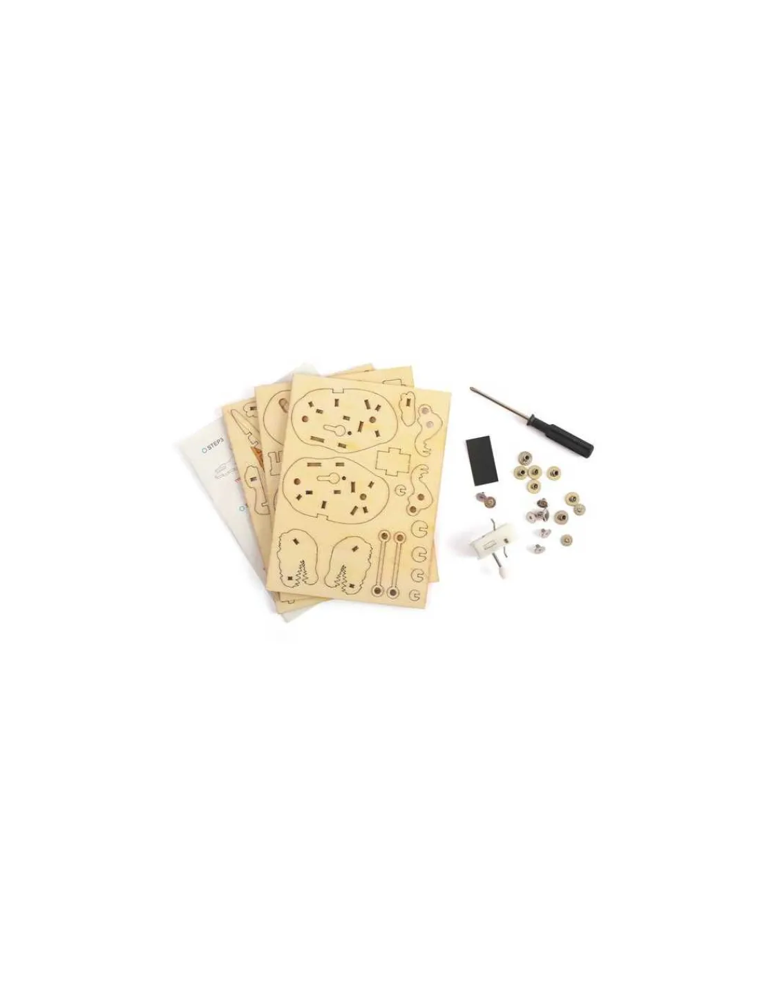 Le coffret contient tout ce dont vous avez besoin pour mener à bien cette aventure créative : des planches de bois pré-découpées, de la visserie, un papier ponce pour parfaire les détails, un tournevis, le mécanisme à remonter et un mode d’emploi détaillé.