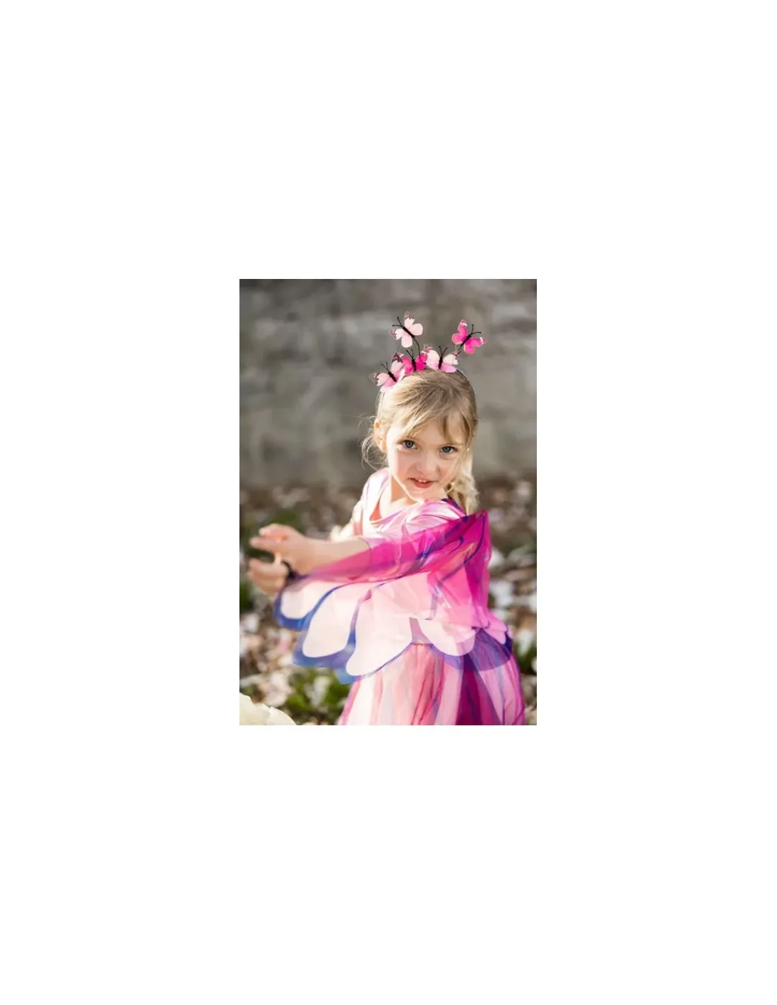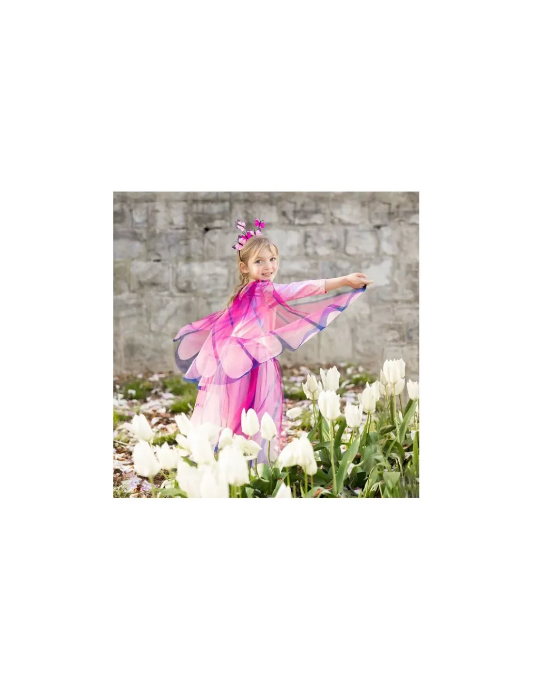Les ailes attachées comprennent des boucles pour les doigts conçues pour flotter et battre à chaque mouvement. Ils ajoutent une touche supplémentaire de magie et d’émerveillement à la journée de votre enfant. Enfilez votre robe, placez le serre-tête et transformez-vous en papillon.