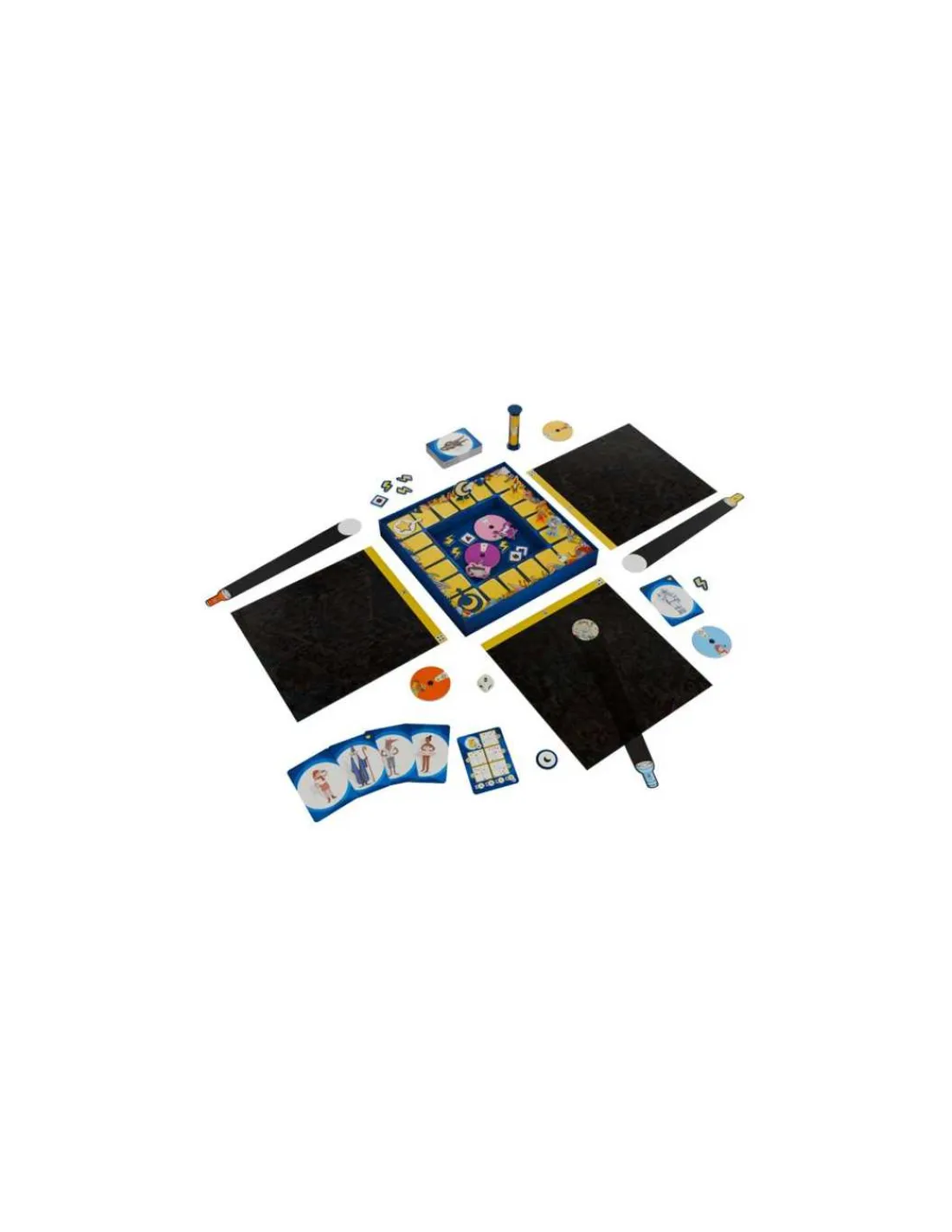 Ce jeu contient 5 plateaux, 5 lampes de poche magique, 5 compteurs, 65 cartes, 7 pions, 12 jetons, 1 dé, 1 sablier, 1 poster et la règle du jeu.