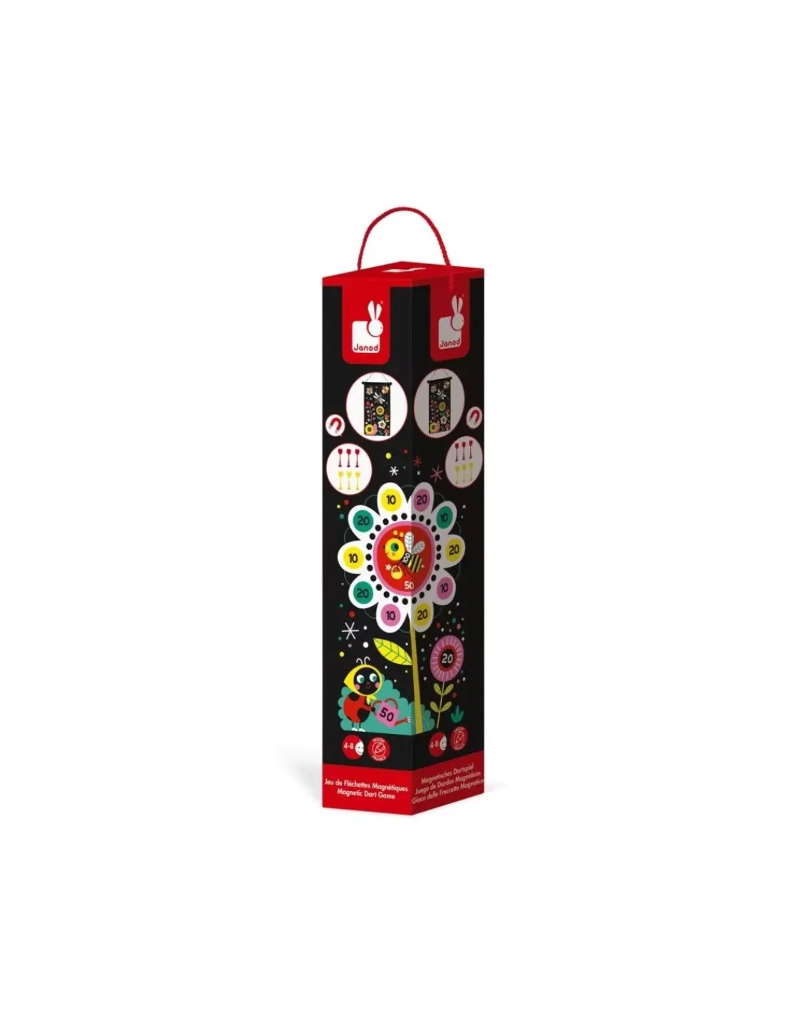 Découvrez le jeu de fléchette magnétique jardin de Janod, un jeu réversible sur le thème du jardin et des fleurs, livré avec 6 fléchettes en plastique (3 rouges et 3 jaunes) et équipé d’une ficelle en coton pour le suspendre. Pour les enfants de 4 à 8 ans.