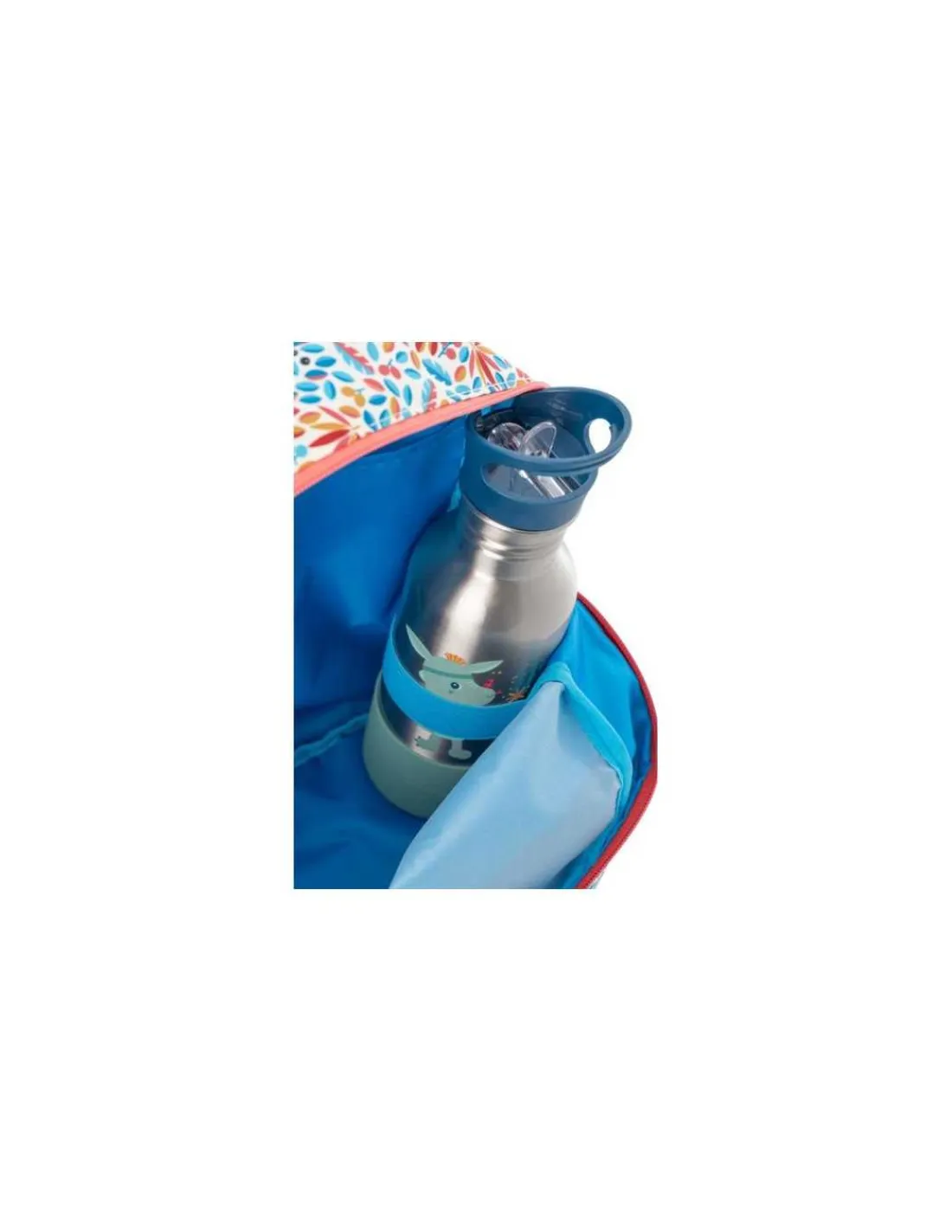 Un sac à dos avec une tête brillante et un élastique pour maintenir la gourde de votre enfant et qui peut contenir un petit cahier (format 17 x 22 cm).