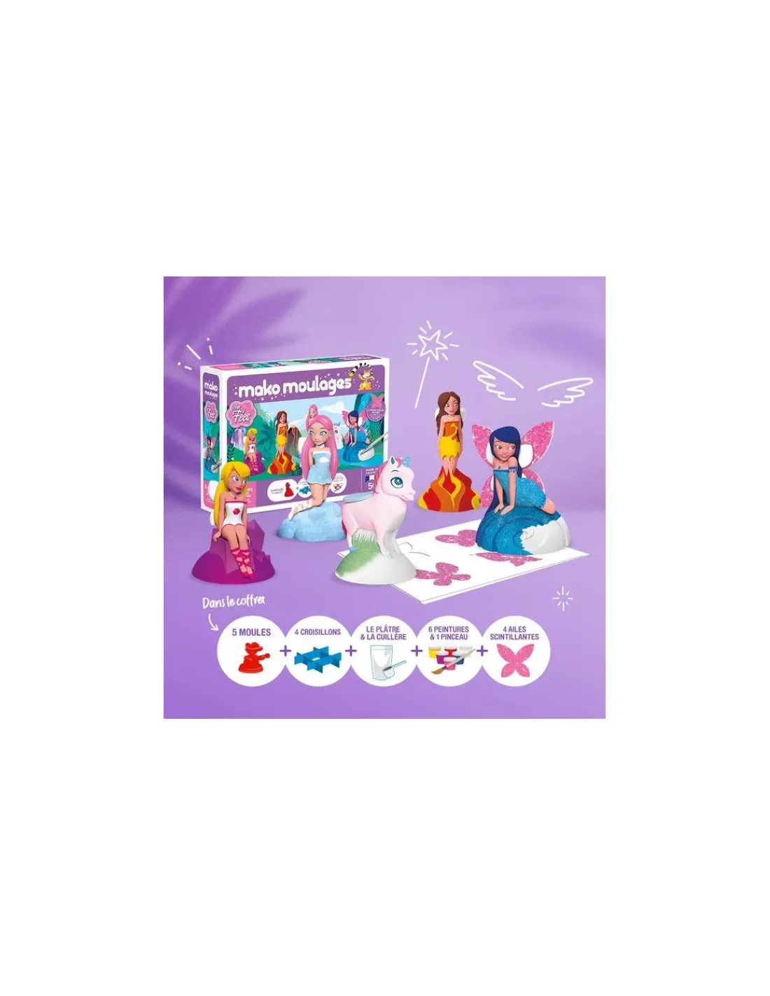 Le coffret créatif contient 5 moules en latex, 1 sachet zippé refermable de 800g de plâtre, 6 pots de peinture 5ml : jaune, rouge, blanc nacré, bleu pailleté, violet nacré et rose, 4 croisillons, 1 pinceau, 1 cuillère doseuse, 1 planche de 4 paires d’ailes scintillantes et une notice d’utilisation.