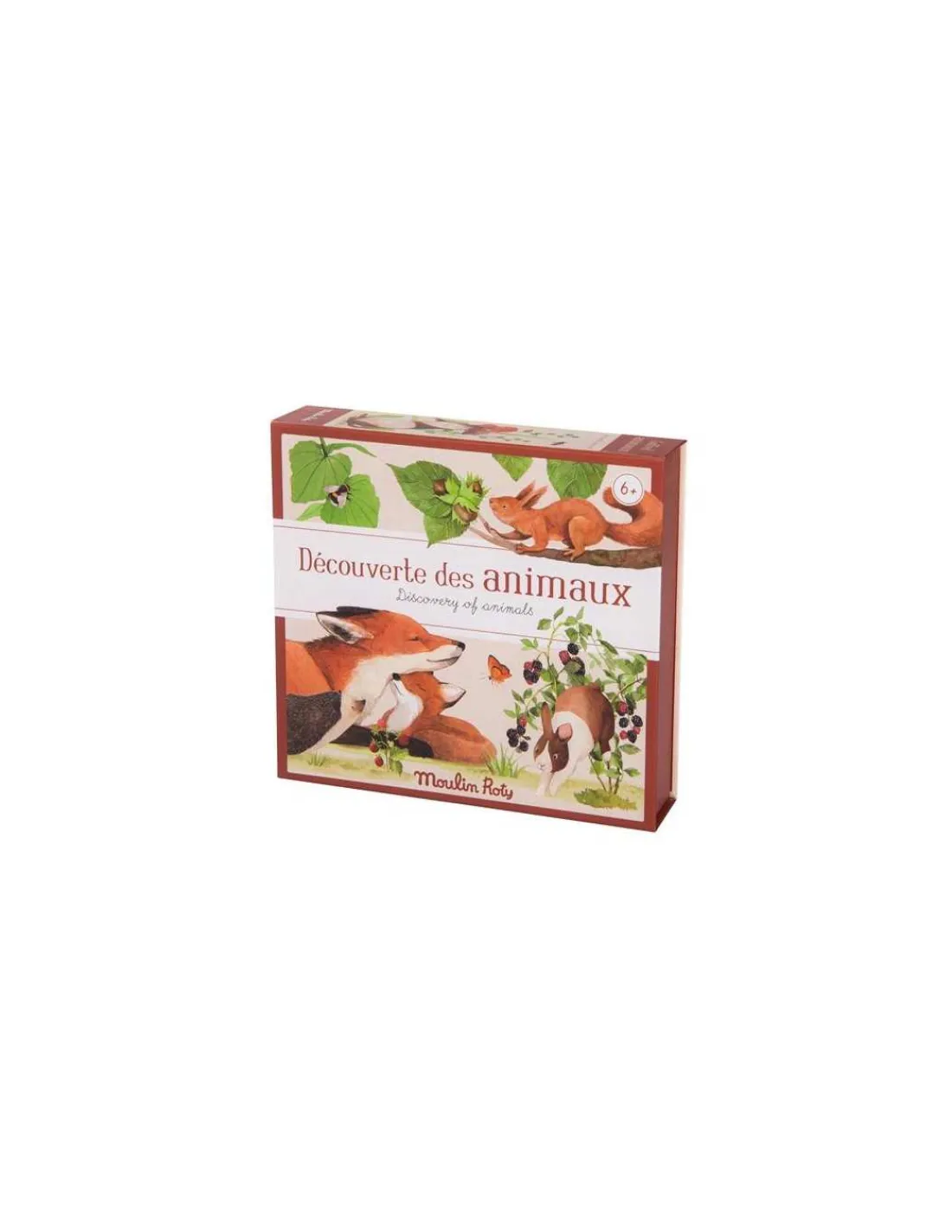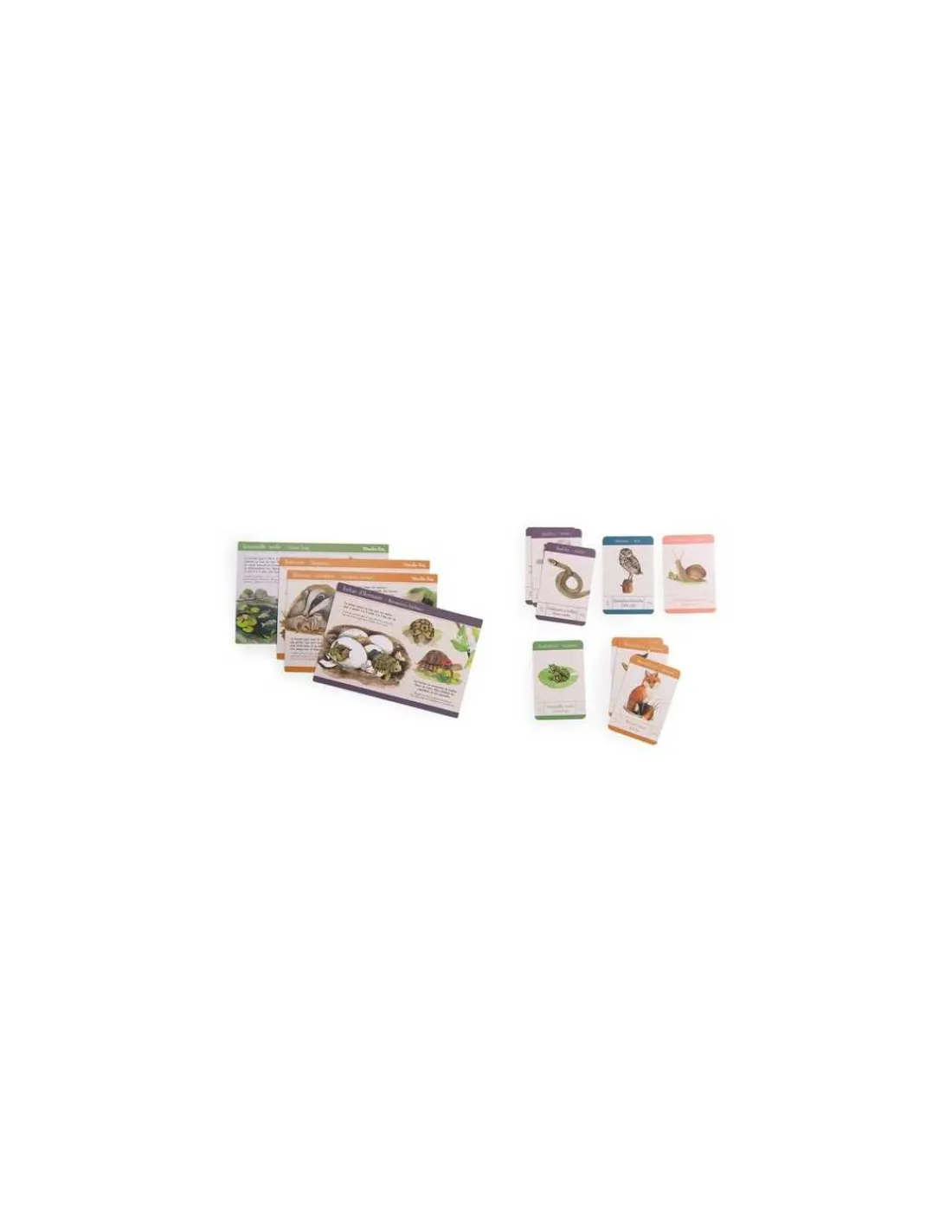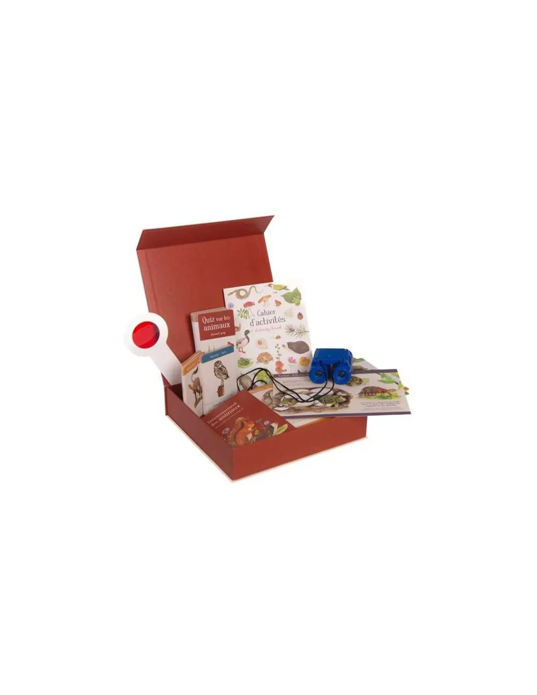 En ouvrant la boite, vous découvrirez 27 accessoires : 4 cartes pour tout savoir sur les animaux, 16 cartes animaux, une paire de jumelles, un cahier d’activités, un quiz sur les animaux, une affiche dans la nature, un dépliant l’environnement des animaux et 2 cartes mystère et la loupe magique.