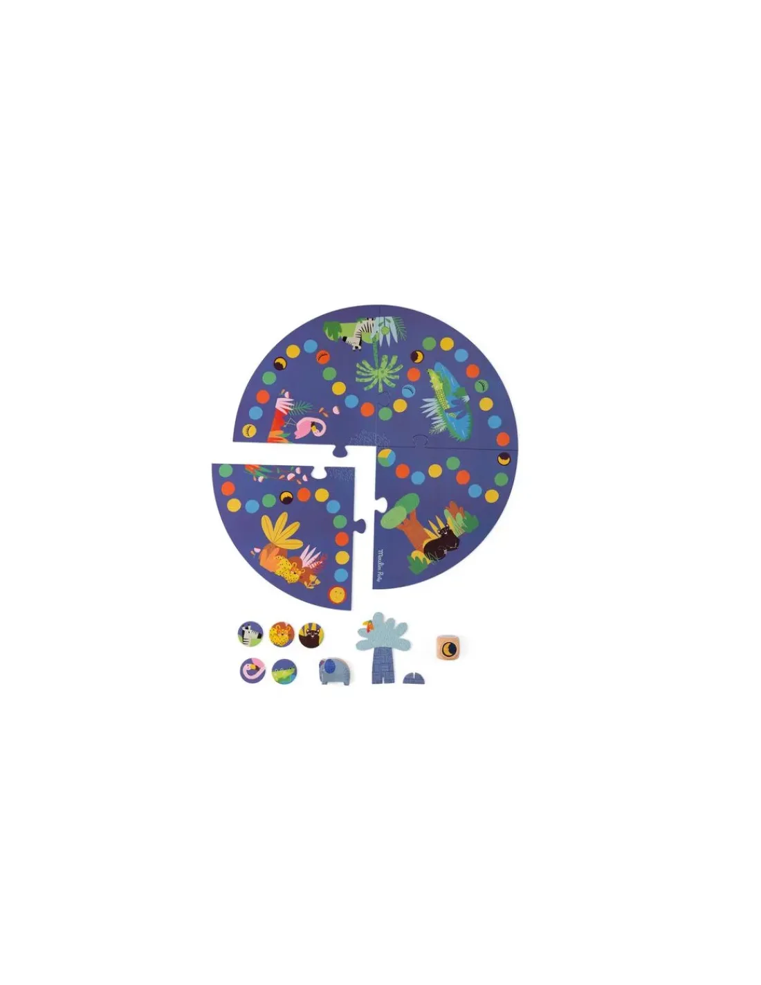 Le jeu contient 1 plateau illustré, 1 dé et 5 jetons animaux.