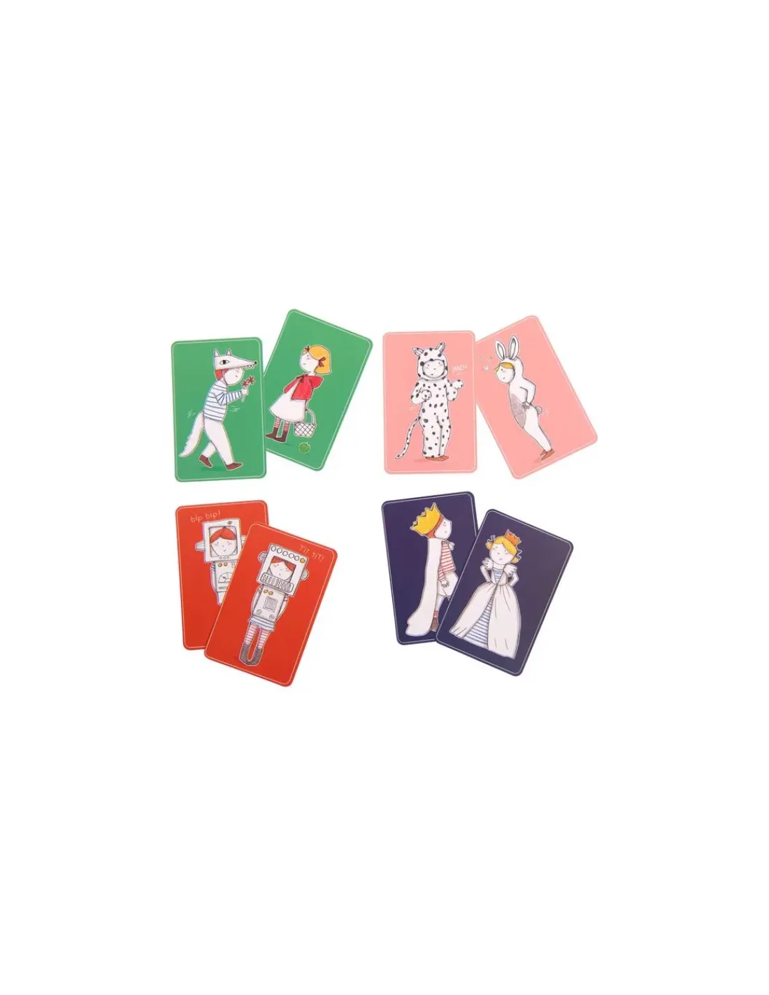 Aujourd’hui c’est mercredi et les enfants se sont déguisés en duo. Dans le jeu de cartes Mistrigri, toutes les cartes forment une paire : le roi avec la reine, le loup avec le petit chaperon rouge… mais gare au Mistigri avec les petits coquins chien et chat. Contrairement à la version classique, le gagnant est, cette fois-ci, le joueur qui finit la partie avec la carte Mistigri!