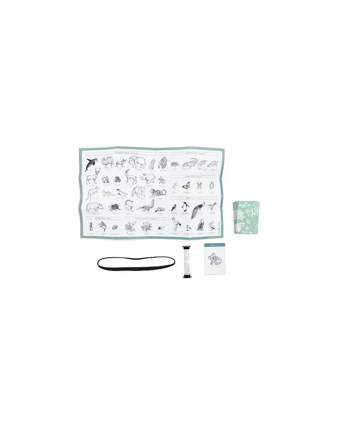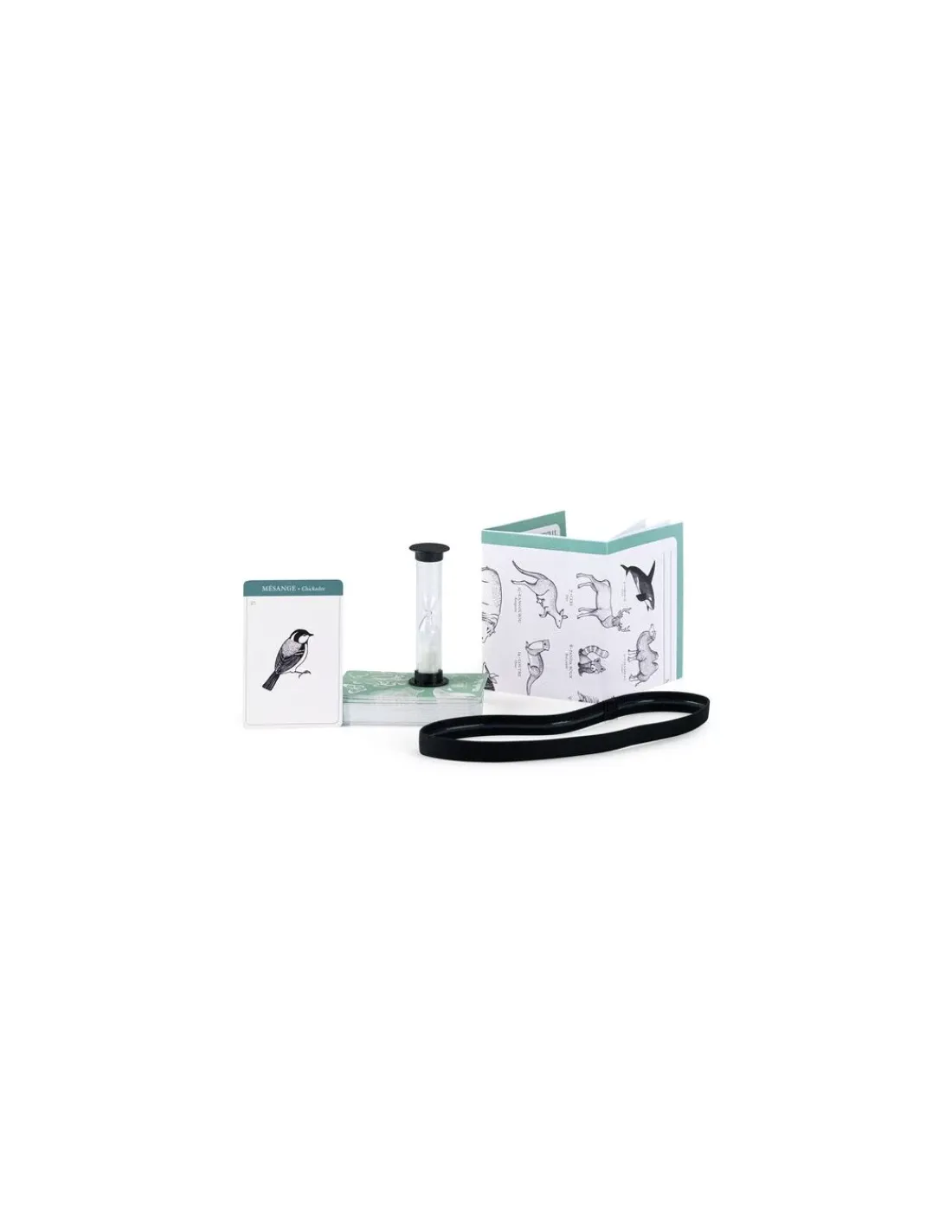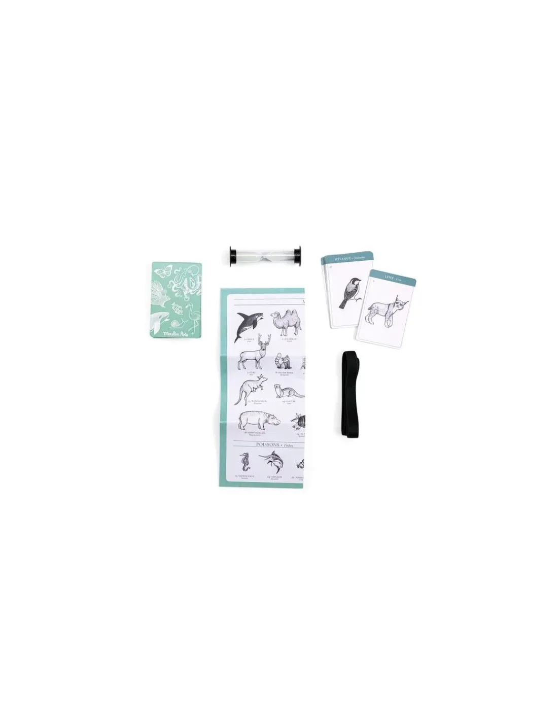 Placez le bandeau autour de votre tête, glissez la carte piochée face au public et essayez de deviner votre animal en posant des questions avant le fin du sablier. Les images contrastées en noir et blanc aideront l’enfant à se focaliser sur les détails (rayures, taches…)