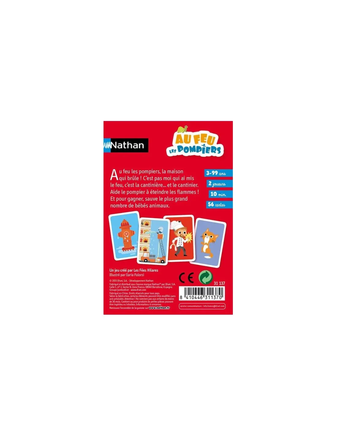 Découvrez le jeu de cartes Au feu les pompiers de Nathan, un jeu de bataille revisité pour les enfants à partir de 3 ans, qui vont s’amuser à sauver des flammes, un maximum de bébés animaux. Un jeu idéal pour les fans de la comptine et des pompiers.
