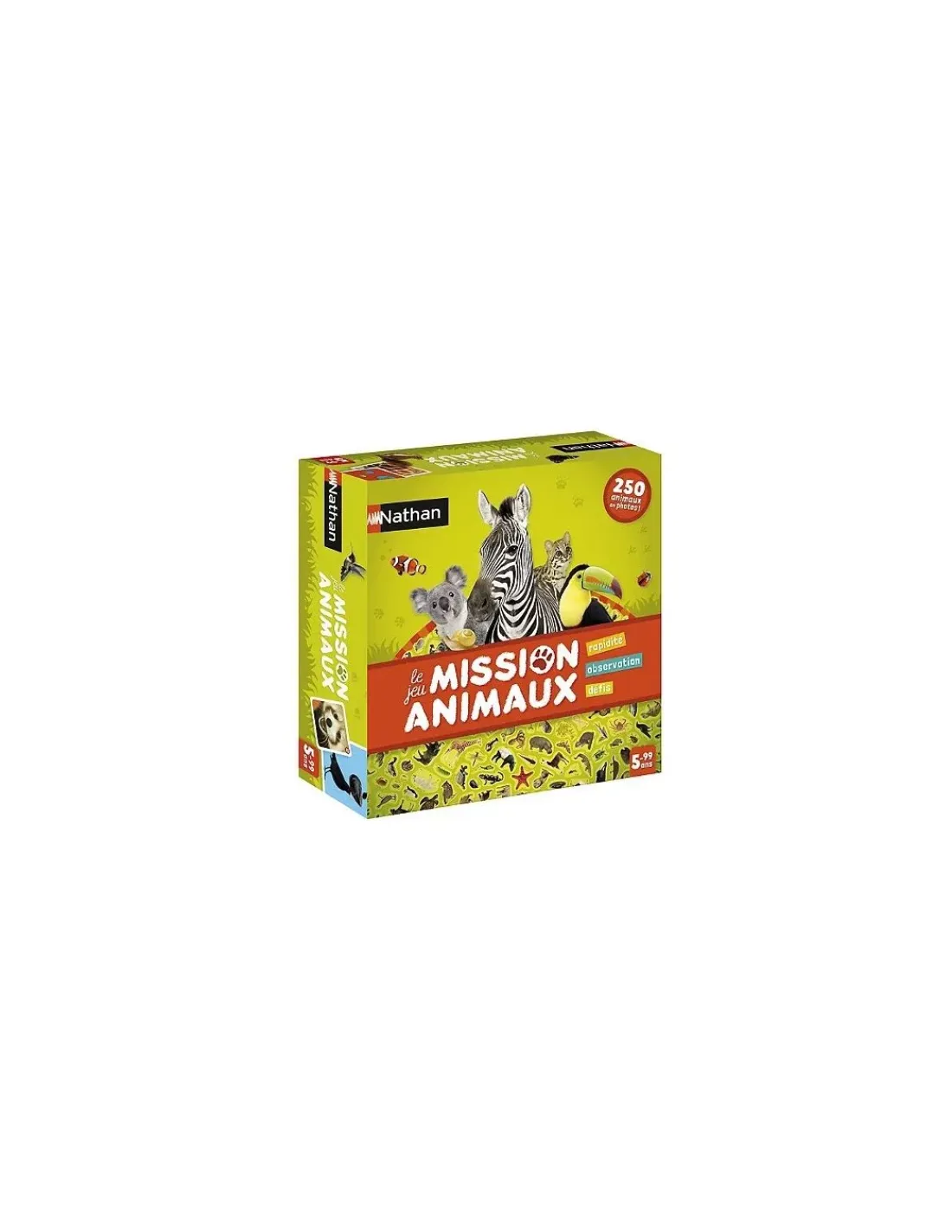 Découvrez le jeu Mission animaux de Nathan, un jeu d’observation et de rapidité autour des animaux dès 5 ans. Des cartes avec de vraies photos d’animaux qui donneront des indices pour les retrouver sur le plateau de jeu.