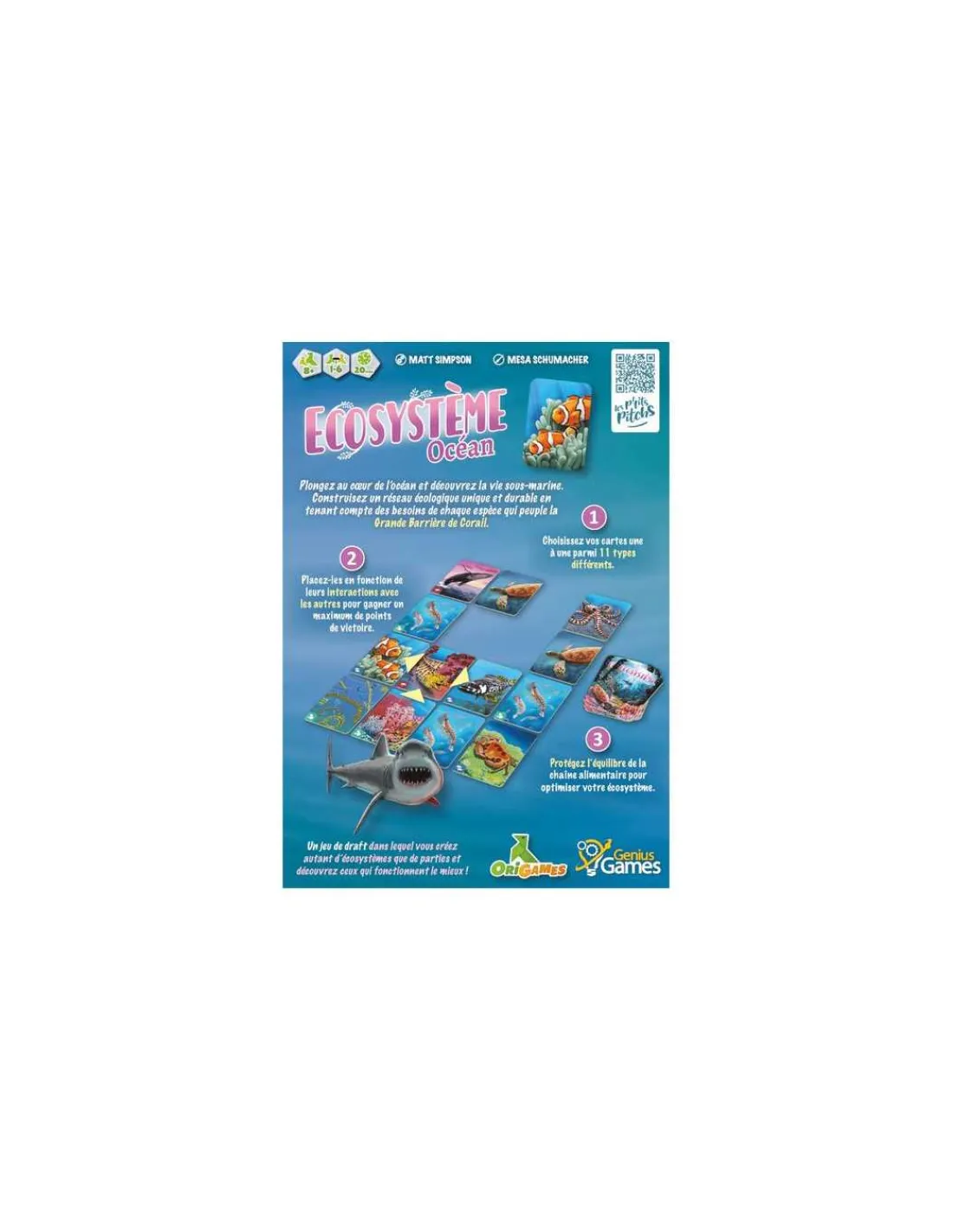 Découvrez le jeu Écosystème Océan de Origames, un jeu de draft dans lequel les joueurs, dès 8 ans, devront créer simultanément un écosystème florissant et diversifié, à l’aide de différentes cartes.