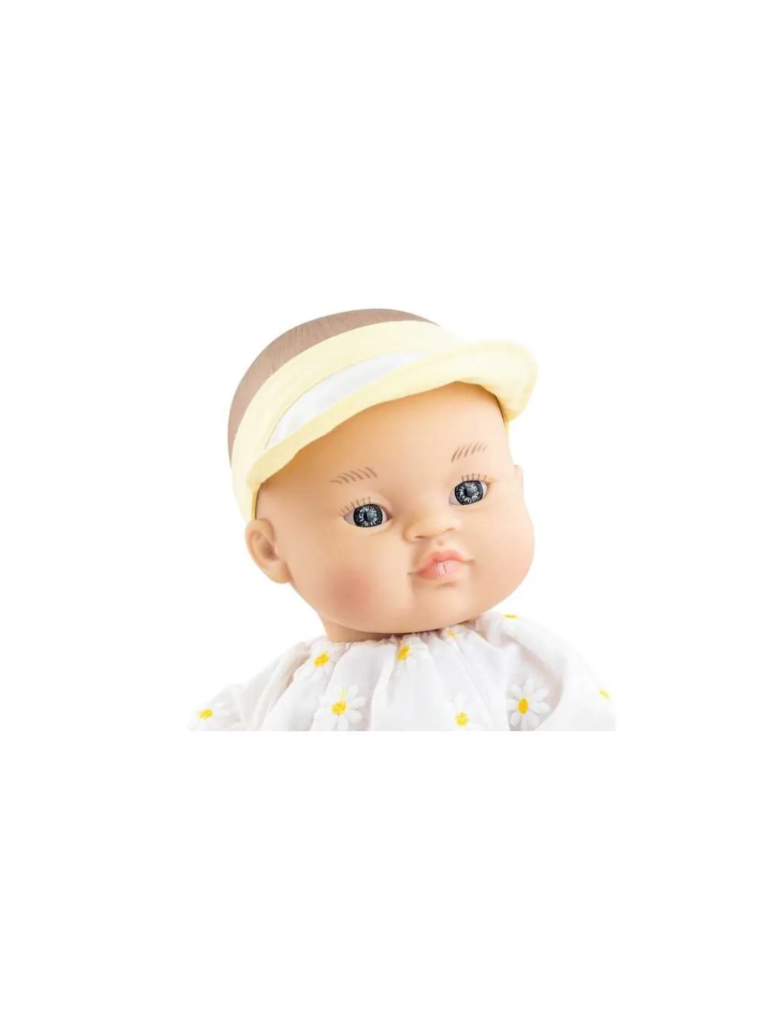 Une poupée en vinyle à la douce senteur de vanille sans cheveux. Johana a un visage très expressif et des yeux gris. Elle est habillée d’un short, d’une blouse fleurie et coiffée d’une casquette assortie.