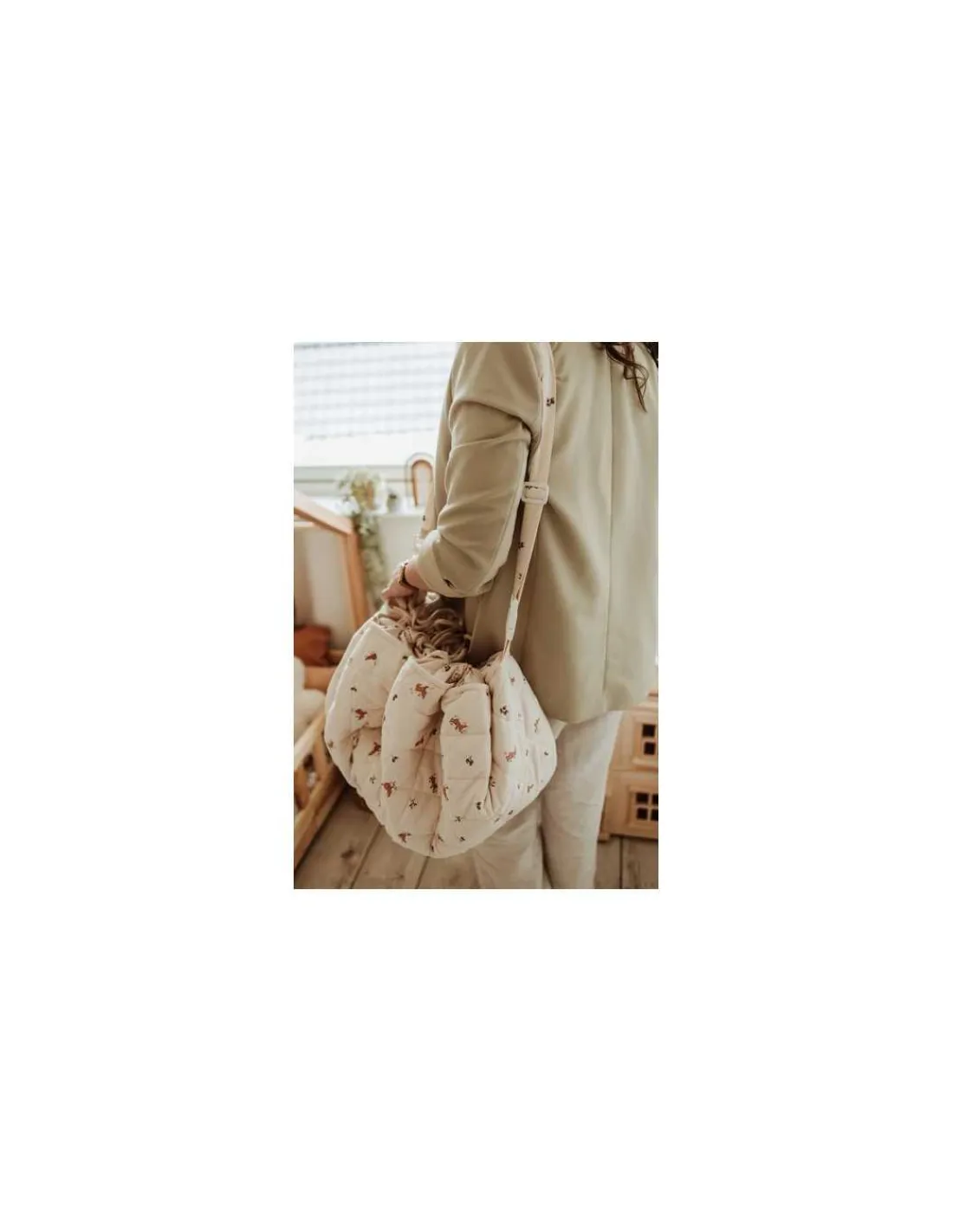 Ouvrez le sac et découvrez un tapis de jeu confortable et moelleux illustré avec des lapins, sur lequel vous pourrez laisser votre bébé jouer. Pratique et fonctionnel, une fois que votre enfant aura fini de jouer, serrez les liens et accrocher le où vous voulez (au porte manteau de la maison ou sur la poussette). La bandoulière réglable et amovible sera très pratique pour l’emmener partout avec vous.