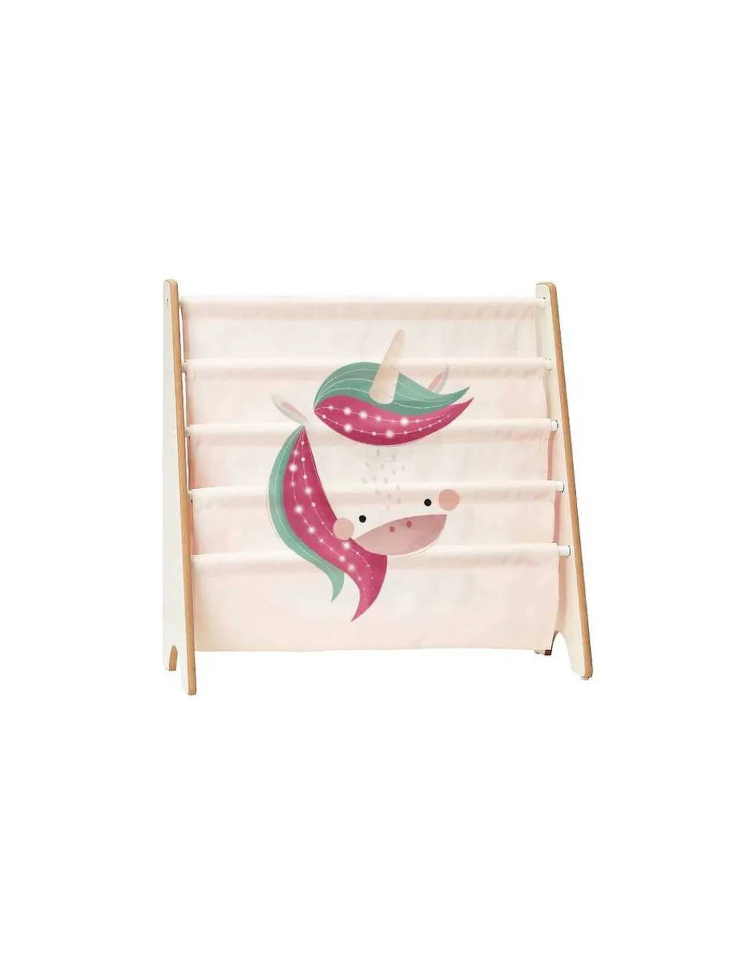 Découvrez la bibliothèque Sparkly la licorne de Sassi, une bibliothèque en tissu et en bois pour ranger les livres de votre enfant.