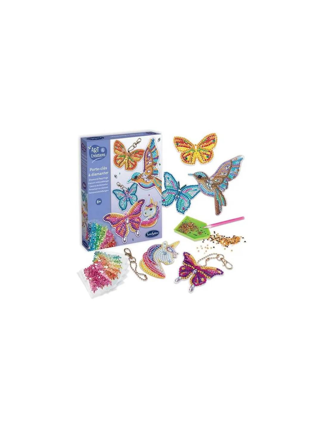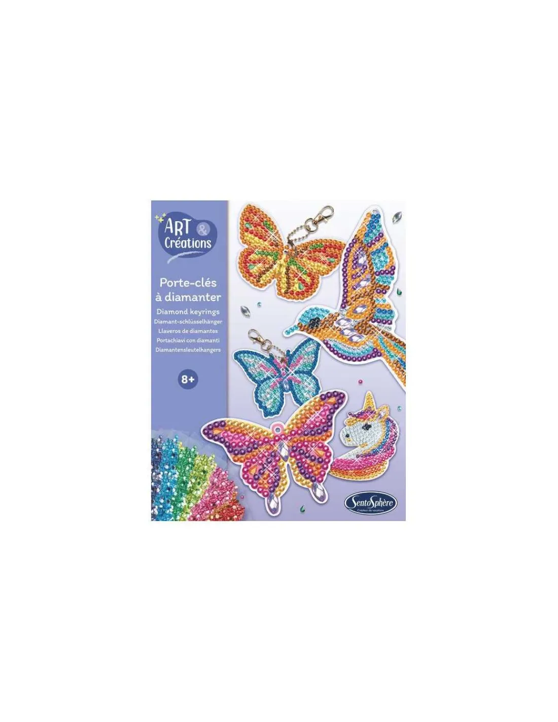 Découvrez les porte-clés à diamanter de Sentosphère, un loisir créatif pour les enfants à partir de 8 ans qui vont créer plus 5 porte-clés diamantés en recouvrant de jolis motifs de milliers de strass multicolores.