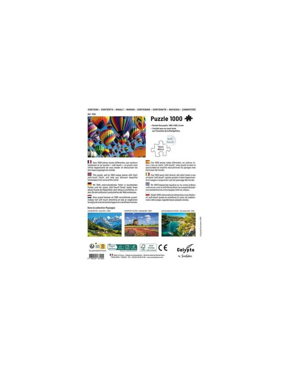 Découvrez le puzzle Montgolfières de la collection Calypto de Sentosphère, un puzzle de 1000 pièces en carton fabriqué en France.