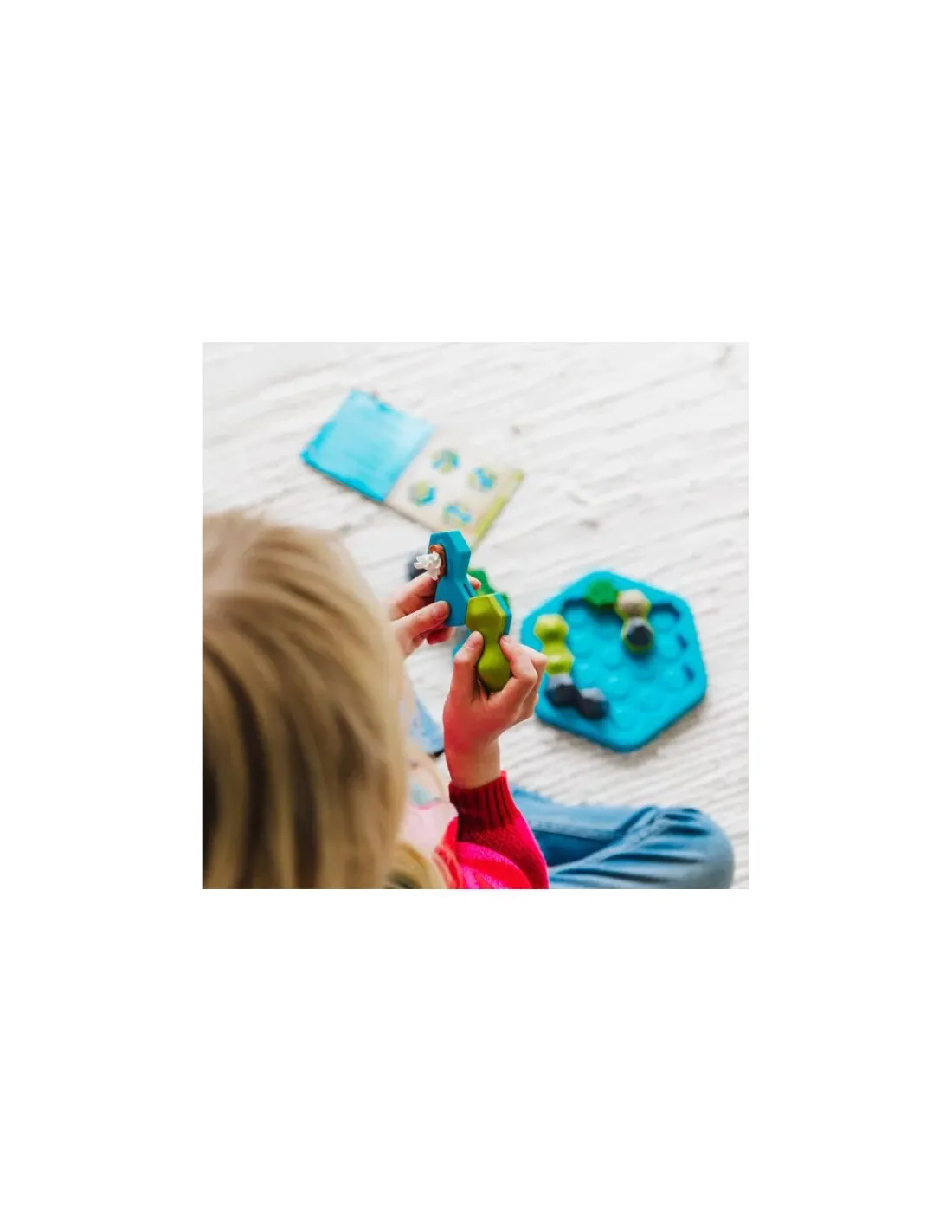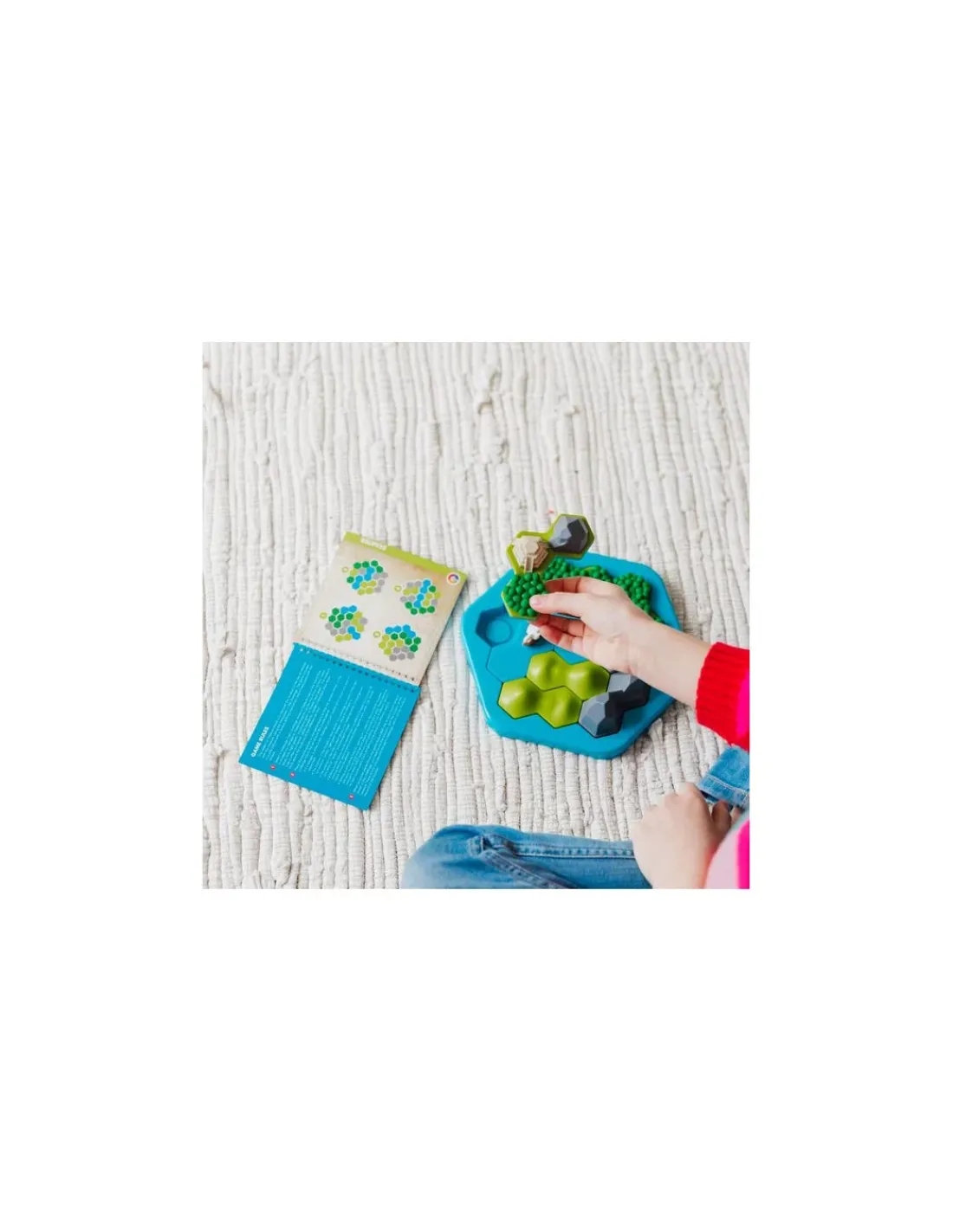 La boite de jeu contient 1 plan de jeu, quatre tuiles de formes hexagonales articulables, une pièce fixe avec la Cité d’Or, un livret de défis avec les solutions et les règles de jeu.