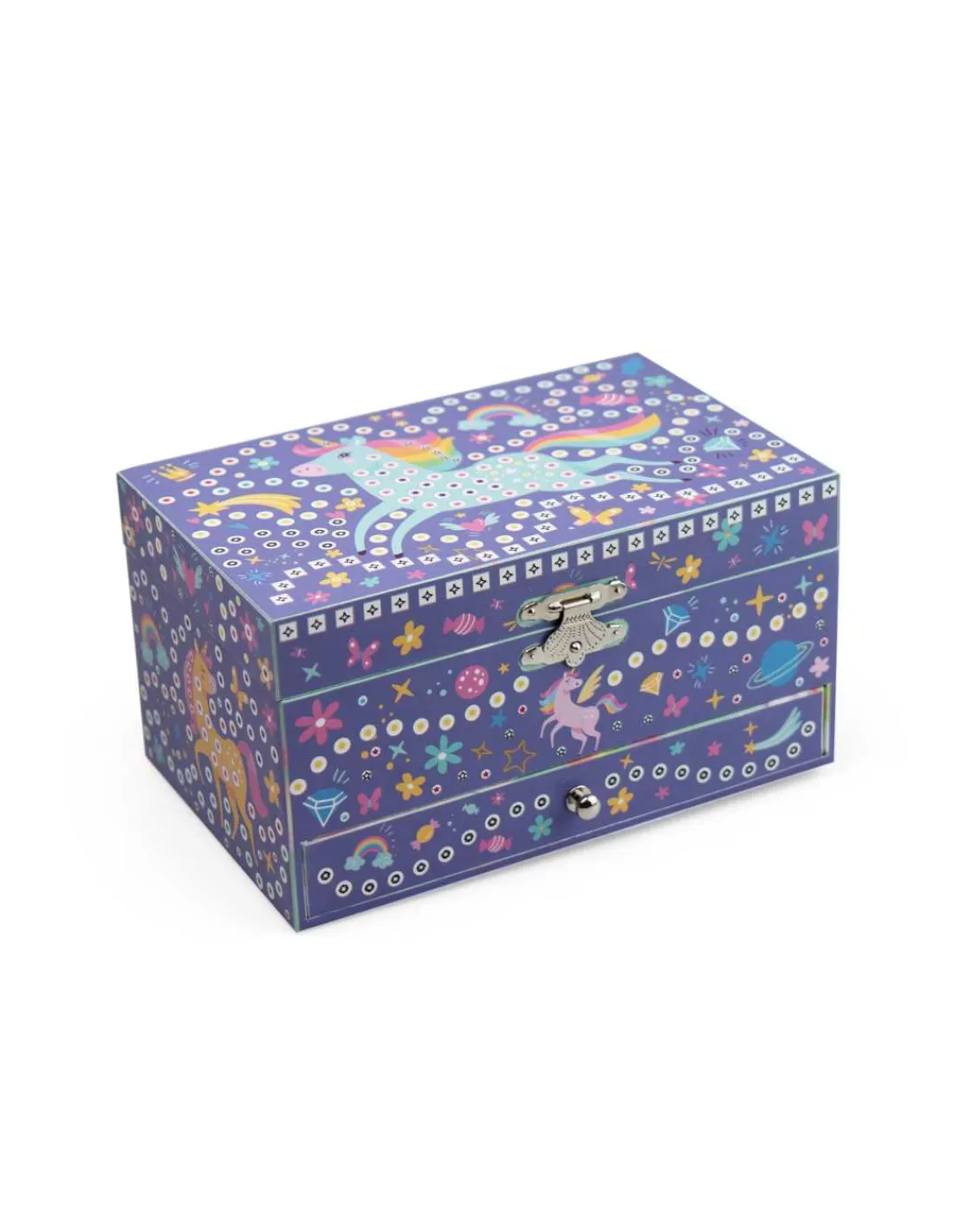 Décorez une magnifique boite à musique, il suffit de coller les petites mousses et joyaux étincelants sur les graphismes correspondants. Un très joli coffret à bijoux pour ranger ses bagues, ses bracelets, ses barrettes… et regardez tourner la licorne au son de la mélodie.
