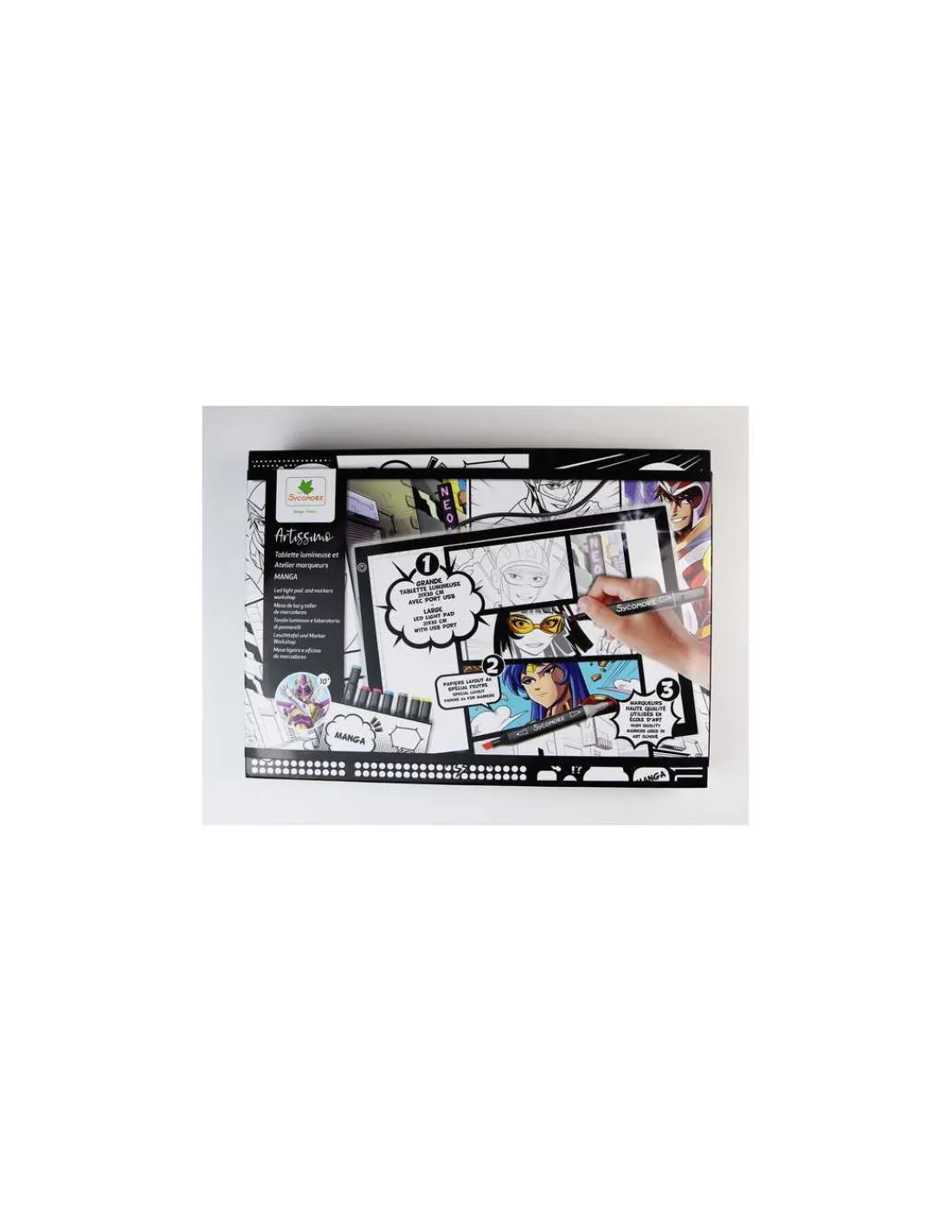 Découvrez le coffret Tablette lumineuse et atelier marqueurs Manga de la collection Artissimo de Sycomore, un coffret de loisirs créatifs pour les enfants à partir de 10 ans sur le thème manga.