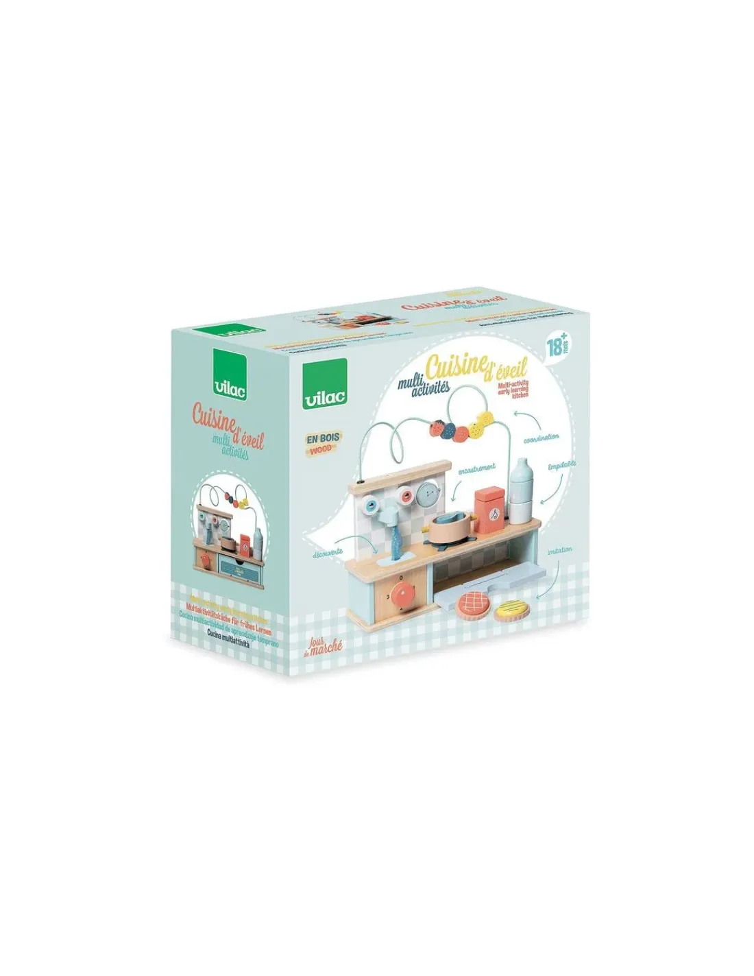 Découvrez la cuisine d’éveil multi-activités de la collection Jour de marché de Vilac, un jouet d’éveil en bois pour les enfants dès 18 mois. Cette jolie cuisine offre plein d’activités pour éveiller les bébés.