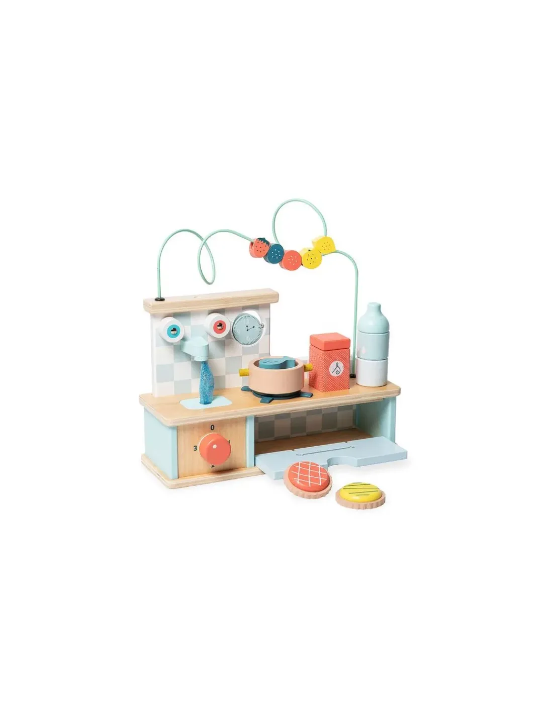 Jouet à empiler, looping, mais aussi jeu d’imitation, ce jouet multi activités offre plein de surprises et d’activités variées. Une ribambelle de fruits se promènent sur un fil et une horloge tourne et tourne sur elle-même. Reconstitue la bouteille empilable dans un camaïeu d’eau et joue les musiciens avec la salière maracas.
