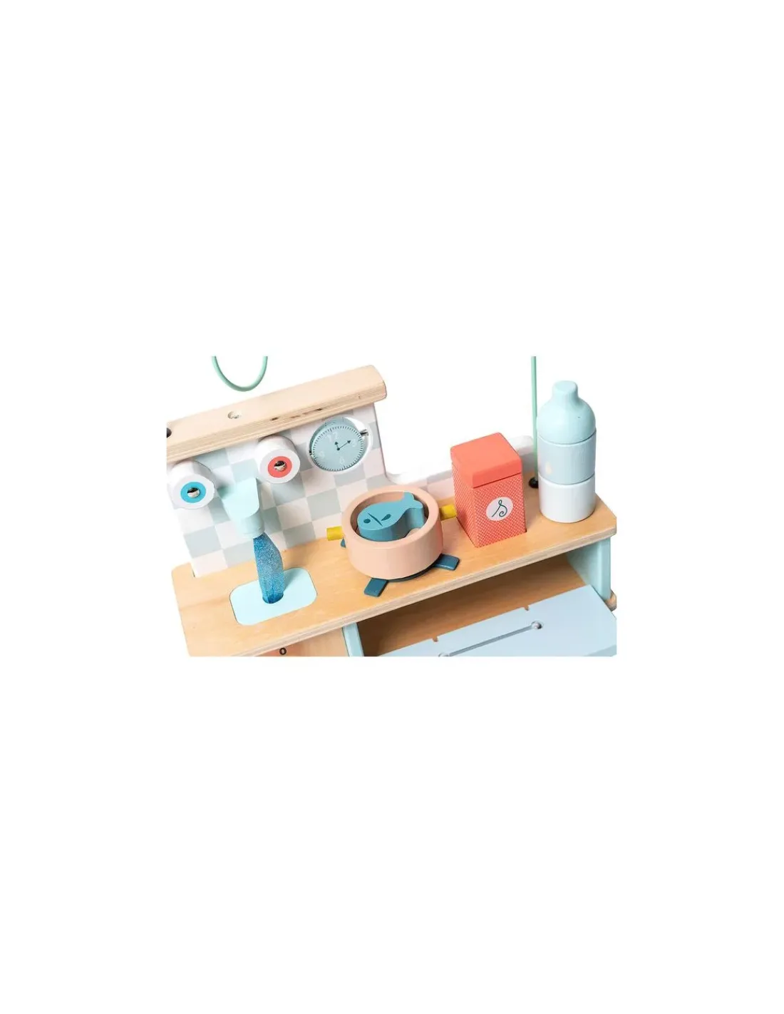 Place le joli poisson dans la casserole à poser comme les grands sur la plaque de cuisson tourbillon. Puis ouvre la porte du four pour déposer les bons gâteaux dans le four et « tic tic tic », tourne le bouton pour commencer la cuisson ! Pour faire la vaisselle, tourne les robinets et joue avec l’eau qui fait « scritch scritch » quand on la touche… mais qui se cache dans l’évier ?