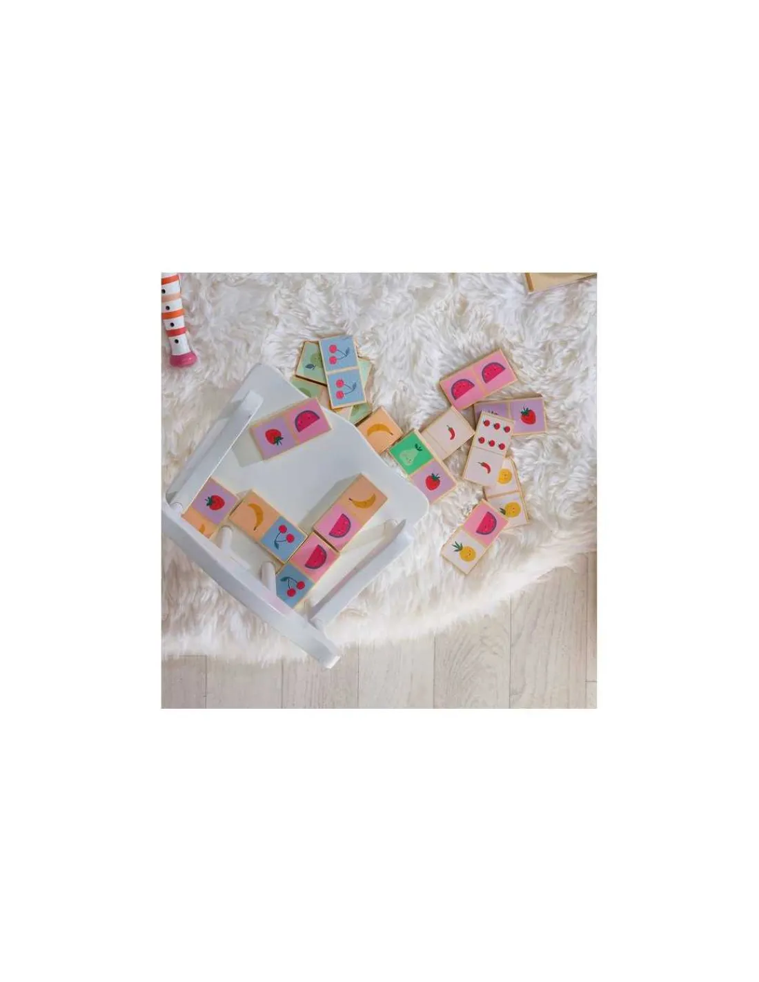 Avec leurs couleurs toutes douces, ils sont adaptés pour les enfants dès 2 ans. Des dominos réversibles avec une face pour associer les fruits et l’autre face pour associer les nombres (représentés par des légumes).