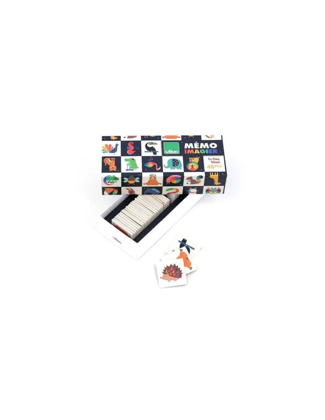 Découvrez le jeu Mémo 48 pièces en bois de Vilac illustré par Andy Westface, un jeu éducatif avec 24 paires à reconstituer à partir de 2 ans avec de splendides illustrations.