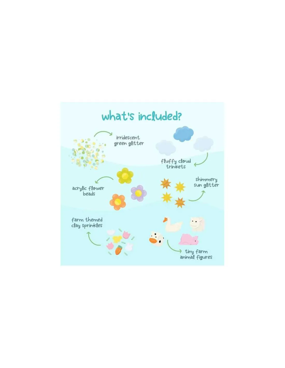 Ce coffret invite les enfants à explorer l’univers de la ferme à travers des textures et des couleurs variées. Il contient des paillettes vertes irisées, des nuages moelleux, des perles de fleurs, des paillettes de soleil, des mini-figurines d’animaux de ferme…