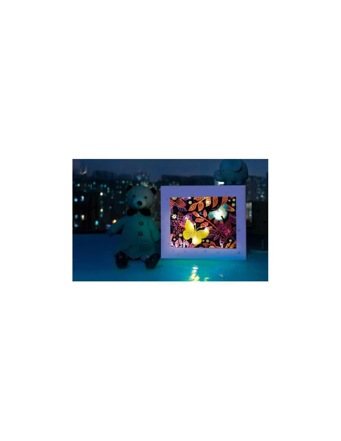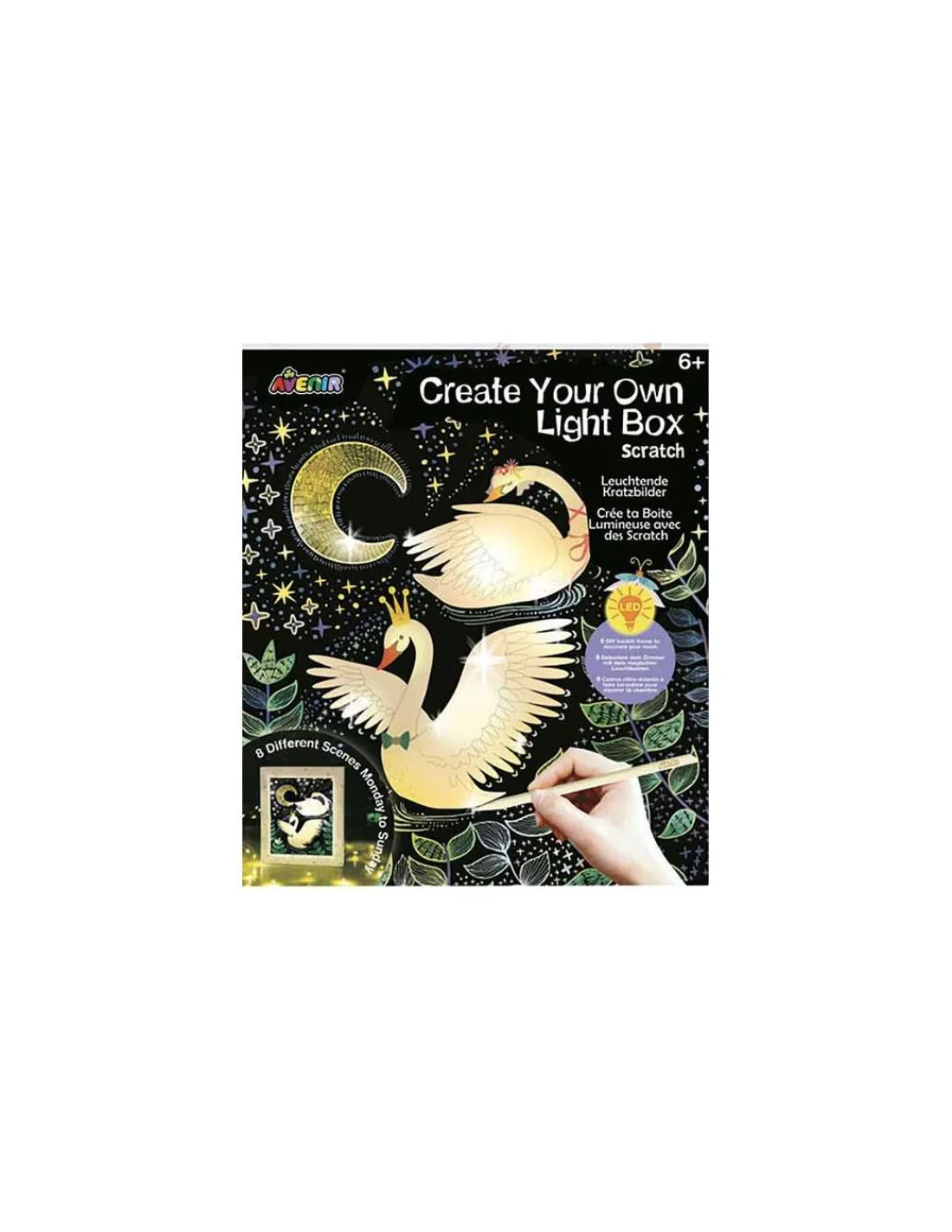 Ce kit permet de créer une magnifique boîte lumineuse en grattant des planches rhodoïd colorées et en les plaçant dans la boîte avec une guirlande lumineuse pour illuminer la chambre de votre enfant. Avec six planches différentes incluses, dont deux phosphorescentes, les possibilités de décoration sont nombreuses, offrant une expérience personnalisable et renouvelable selon les envies.
