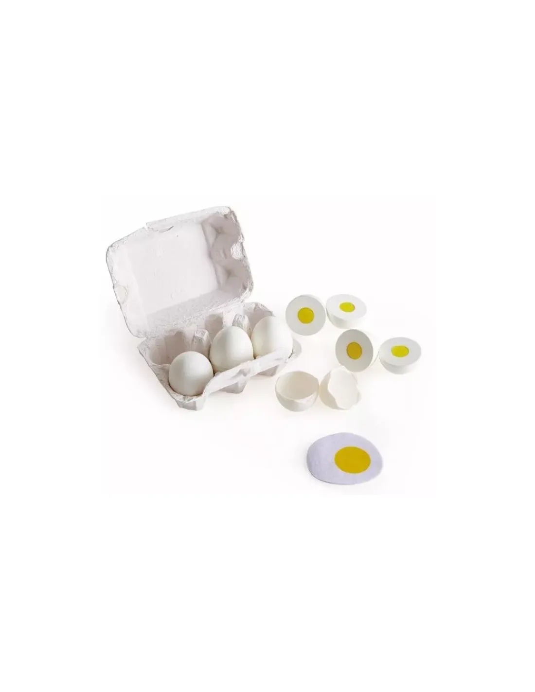 Découvrez la boite d’oeufs de Hape, une boite de 6 oeufs réalistes avec trois oeufs durs à découper et 3 oeufs au plat à ouvrir pour faire une omelette.