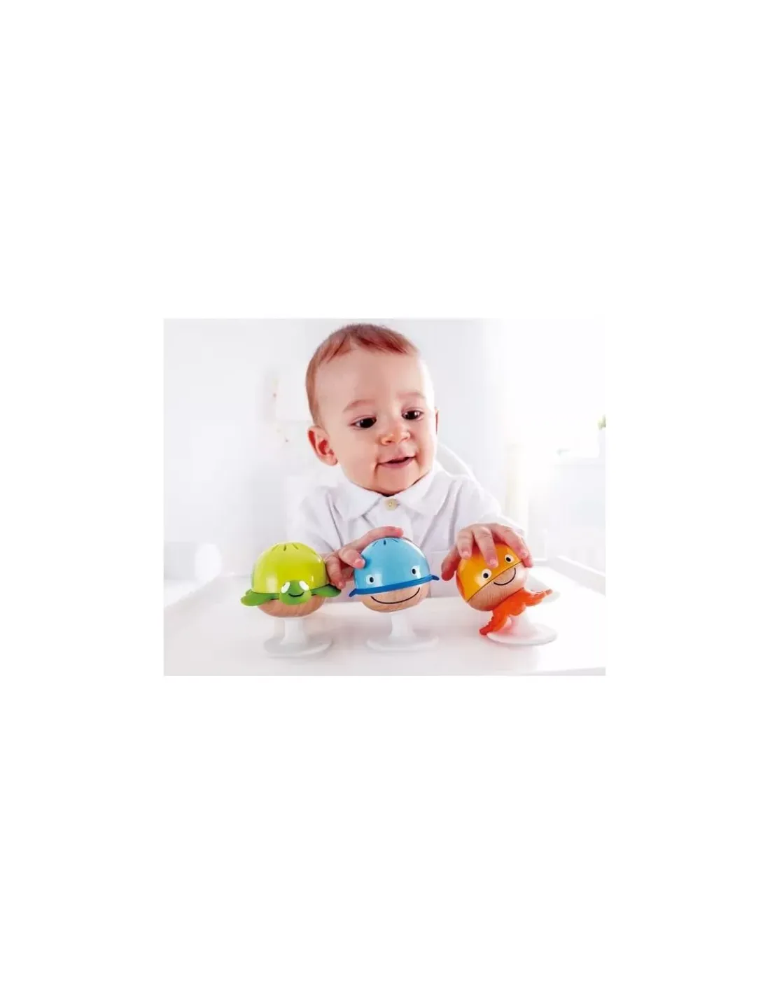 Découvrez les hochets animaux marins de Hape, une ensemble de 3 hochets en bois avec ventouse à poser au sol ou sur la tablette de la chaise haute. Des jouets d’éveil astucieux pour les bébés. Vous allez adorer la pieuvre orange, la tortue verte et la baleine bleue.