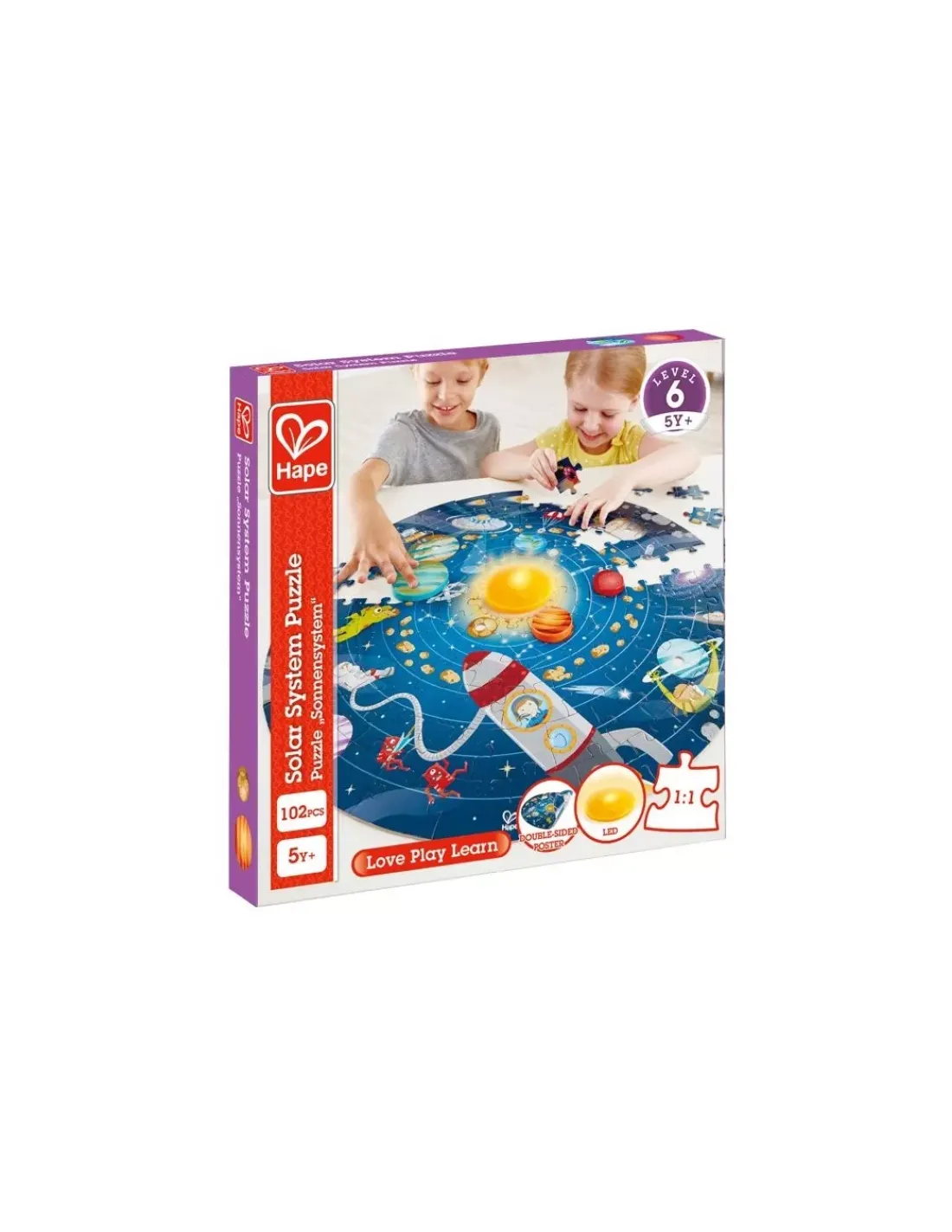 Découvrez le puzzle système solaire de Hape, un puzzle de 100 pièces en carton pour les enfants à partir de 5 ans. Apprends plus de choses sur le système solaire avec ce puzzle de l’univers. Des pièces de puzzles en cartons, des planètes en bois et un soleil brillant à LED qui s’allume lorsque toutes les planètes sont bien placées.