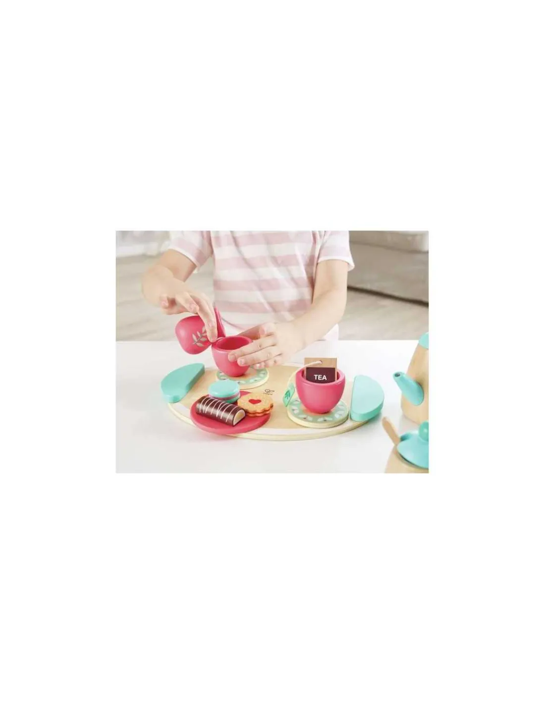 Votre enfant s’amusera à préparer un délicieux goûter à ses doudous et à ses poupées, grâce à ce superbe service à thé comprenant un plateau en bois, une théière avec couvercle, deux tasses à thé et leurs soucoupes, un sucrier et un crémier, un sachet de thé, trois desserts et une assiette.