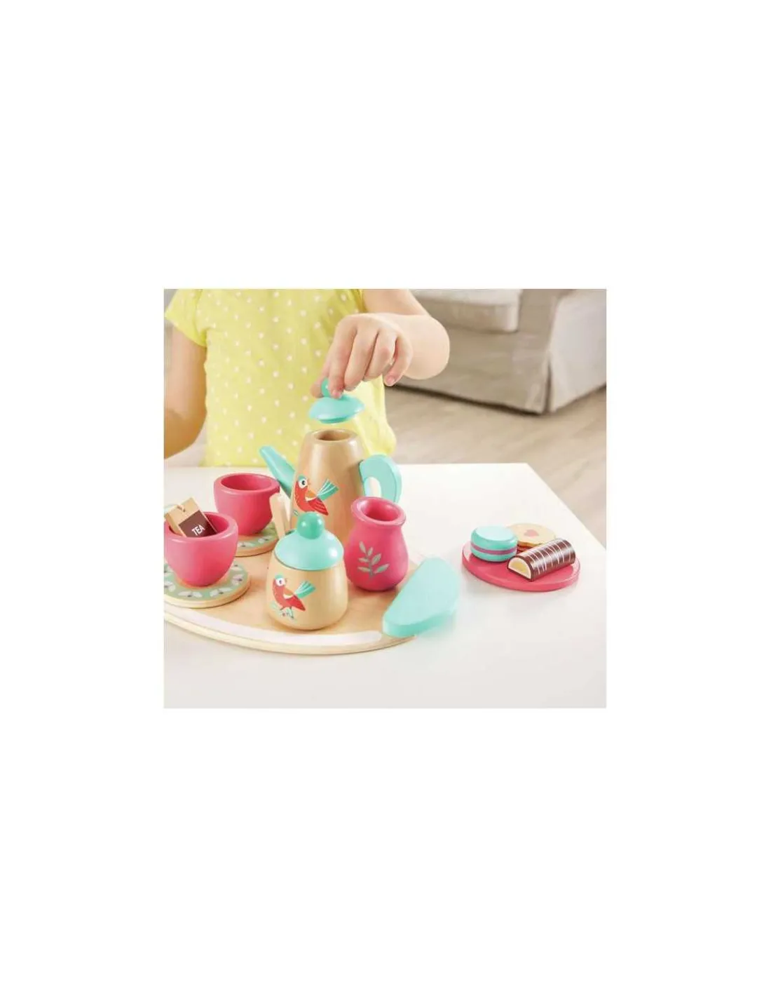 Un ensemble de jouets aux couleurs chatoyantes et orné d’un charmant motif d’oiseau, qui permet aux enfants de pratiquer les bonnes manières et l’art de la conversation, tout en racontant des histoires en sirotant un thé.