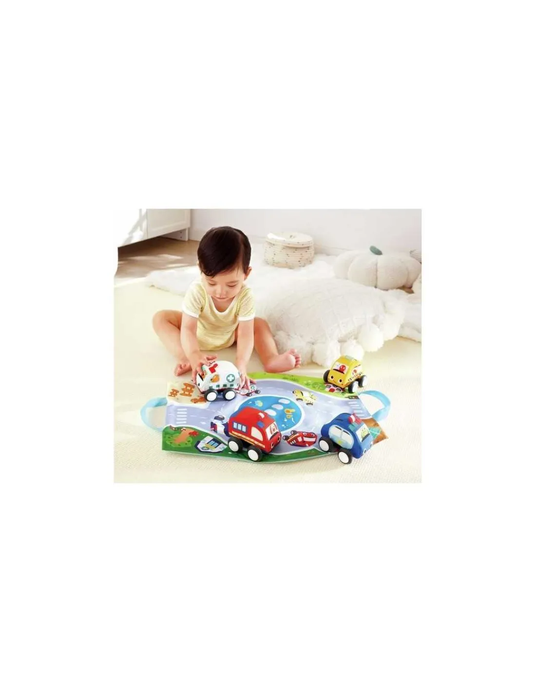 Le sac de rangement pliable se transforme en un tapis de jeu, offrant un espace pratique pour jouer et ranger. Fabriqués dans une matière douce et adaptée aux petites mains, ces véhicules stimulent le toucher, la motricité fine et l’apprentissage visuel.