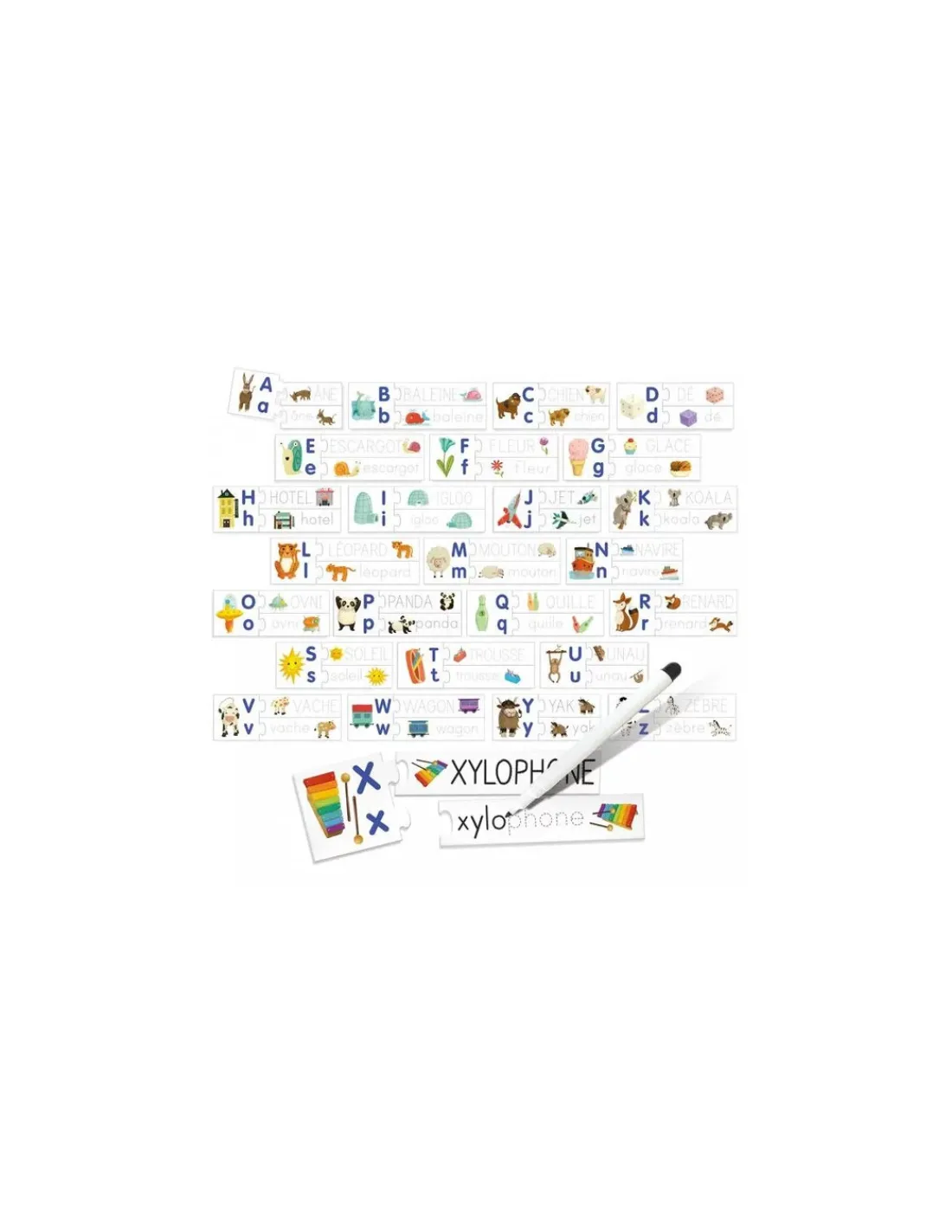 En assemblant cet bel abécédaire coloré, l’enfant apprend à associer lettres, mots et images. Une fois le puzzle terminé, l’enfant s’exerce à écrire les mots en lettres majuscules et en lettres minuscules en décalquant à l’aide du feutre effaçable.