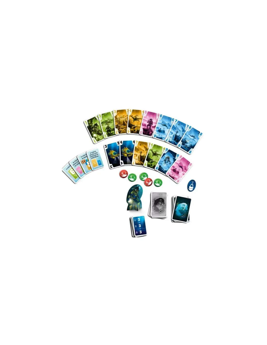 Ce jeu contient 40 cartes Océan, 5 cartes Rappel, 96 cartes Tâche, 6 jetons, 1 pion Commandant, 1 journal de bord et 1 livret de règles.