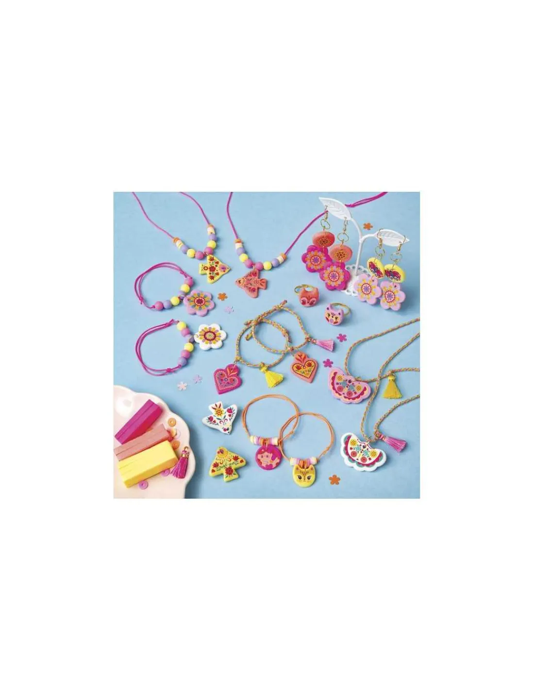 Ce coffret créatif contient 5 blocs de pâte polymère à cuire au four (blanc, jaune, rose, rose fluo, corail), 1 rouleau de modelage et 1 cure-dent, 1 tube de colle, 6 emporte-pièces sur-mesure, du fil orange et rose, du fil tressé, 2 supports de bague, 4 supports de boucles d’oreille, 22 anneaux de connexion, 4 pompons, 64 perles heishis, 24 perles rondes et 1 planche de décalcomanies avec un outil en bois.